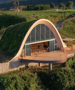 Голландское бюро MVRDV построило в Китае, недалеко от города Чэнду, общественный павильон, который почти полностью сливается с окружающей природой. Деревянное здание с зеленой крышей повторяет форму холма и служит площадкой для мероприятий и обзорной точкой с видами на горы
