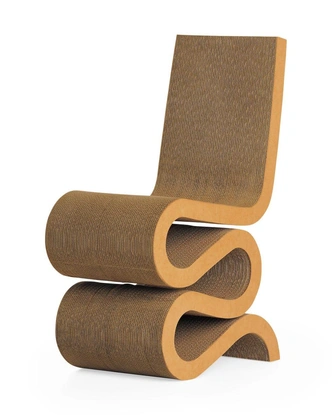 Чередуя гофрированность картона, Гери смог создать стопки, достаточно прочные, чтобы выдержать вес человека. Змеевидная S-образная форма кресла Wiggle резко контрастирует с грубым материалом.