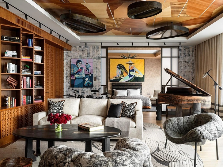 Проект Kirill Istomin Interior Design & Decoration в Москве. Кресло из фетра, дизайнер Аяла Серфати. Журнальный стол из черного сланца, дизайнер Эммануэль Джонкерс. Обои ручной печати. Диван выполнен на заказ по эскизам Кирилла Истомина. Предметы искусства из коллекции владельца. Рояль из макассара на массивных фигурных ногах, напоминающих африканские тотемы.