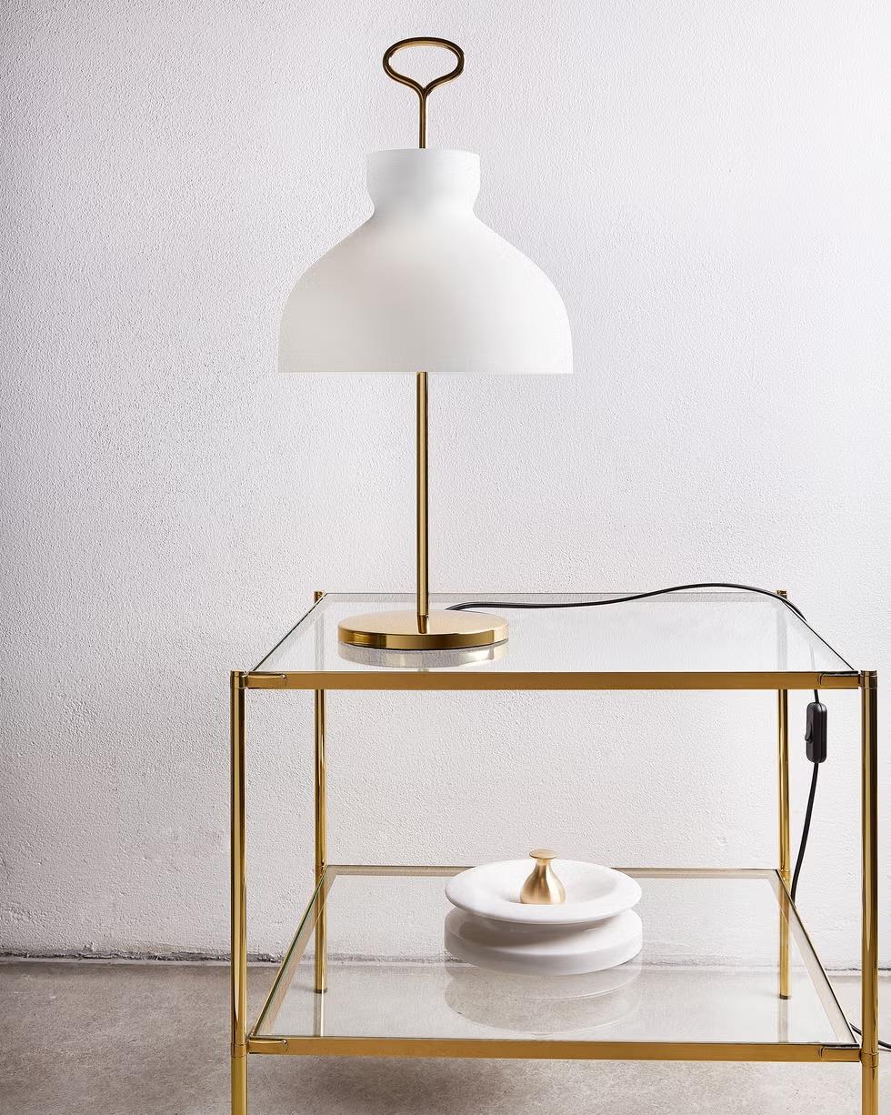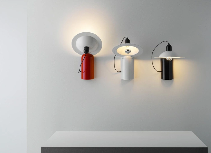 Настольная лампа Lampiatta, разработанная Джонатаном Де Пасом, Донато Д'Урбино и Паоло Ломацци в 1971 году, сочетает функциональный дизайн и универсальность. Белый алюминиевый абажур легко регулируется благодаря четырем пазам в основании, а съемное металлическое основание позволяет крепить лампу к стене. Изготовленная из полированного поликарбоната, она соединяет прочность и минималистичную эстетику.