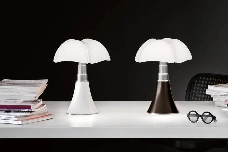 Настольная лампа Pipistrello выделяется на фоне многих модернистских светильников 1960-х годов своими изогнутыми, динамичнымм линиям. Разработанная в 1965 году Гаэ Ауленти для выставочных залов Olivetti в Париже и Буэнос-Айресе, позже лампа была запущена в серийное производство компанией Martinelli Luce. Эта икона итальянского дизайна, отличающаяся динамичной формой и телескопическим рассеивателем, в настоящее время входит в постоянную коллекцию Музея современного искусства (MoMA).