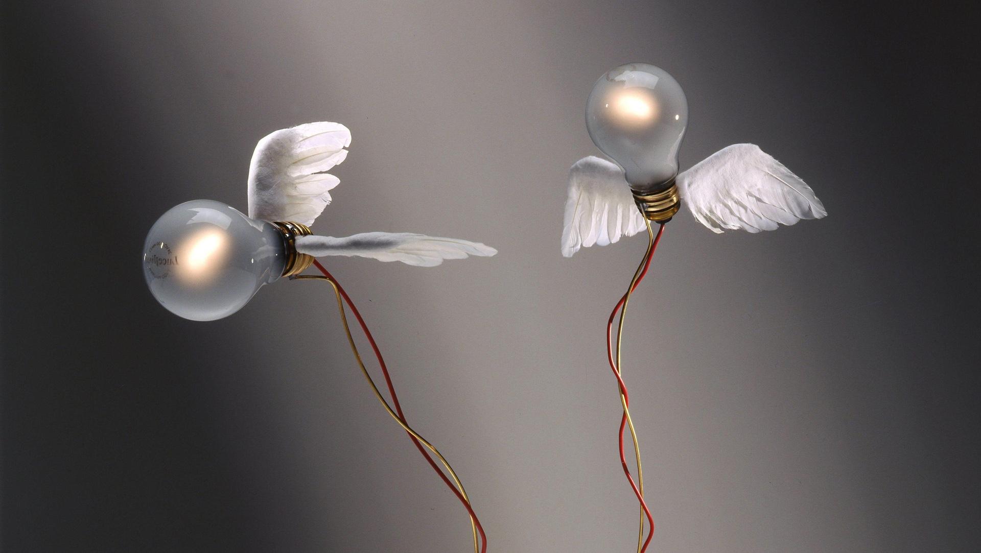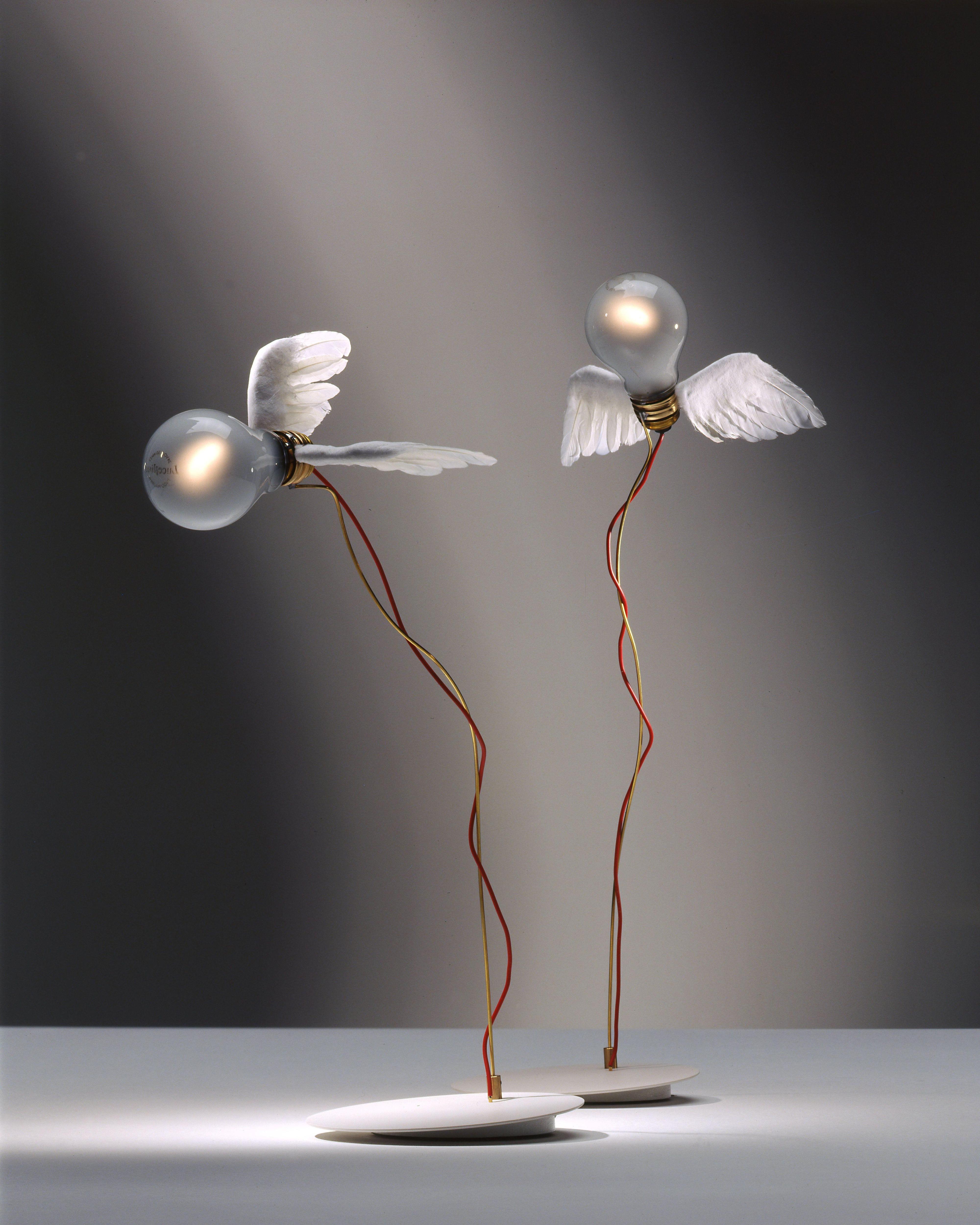 В светильнике Lucellino от Инго Маурера лампочка парит, как маленькая птичка. Используемые материалы — крылья из гусиных перьев, стекло, латунь и пластик — объединяют мастерство и техническую точность. Лампа создана специально для серии Lucellino и производятся только компанией Ingo Maurer