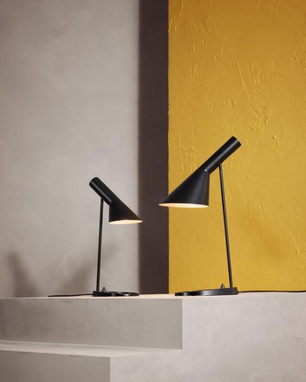 Светильник AJ от Арне Якобсена, разработанный для отеля SAS Royal в Копенгагене, рассеивает прямой свет вниз благодаря наклоняющемуся белому внутреннему абажуру. Семейство светильников AJ включало настольные, настенные и подвесные версии, являвшиеся частью комплексного дизайна интерьера. Геометрические линии делают эту лампу образцом скандинавской строгости и органичного сочетания формы, функции и архитектуры.