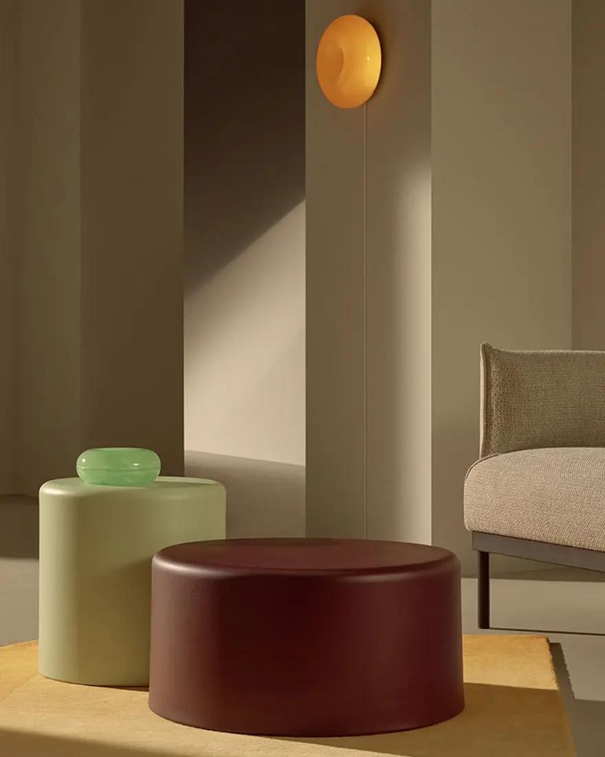 В выключенном состоянии лампа Varmblixt Сабины Марселис выглядит как скульптурный элемент, а во включенном — активизирует диалог между материалом и освещением. Повторяющийся мотив в работах дизайнера — форма пончика — используется здесь как отсылка к идее непрерывности и бесконечности. Свет, проходящий сквозь цветное стекло, подчеркивает изогнутые поверхности и создает теплое, рассеянное свечение.