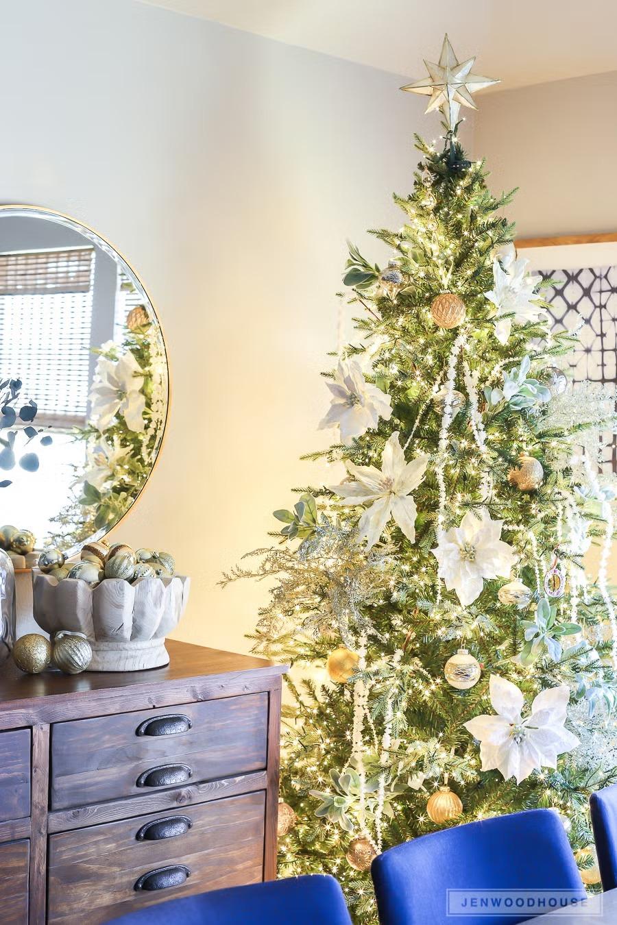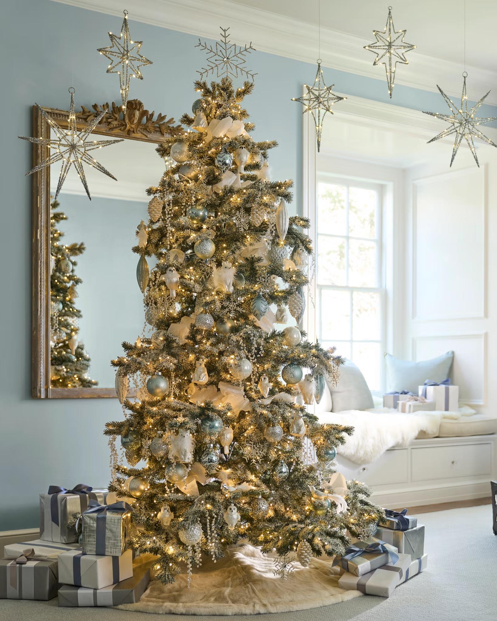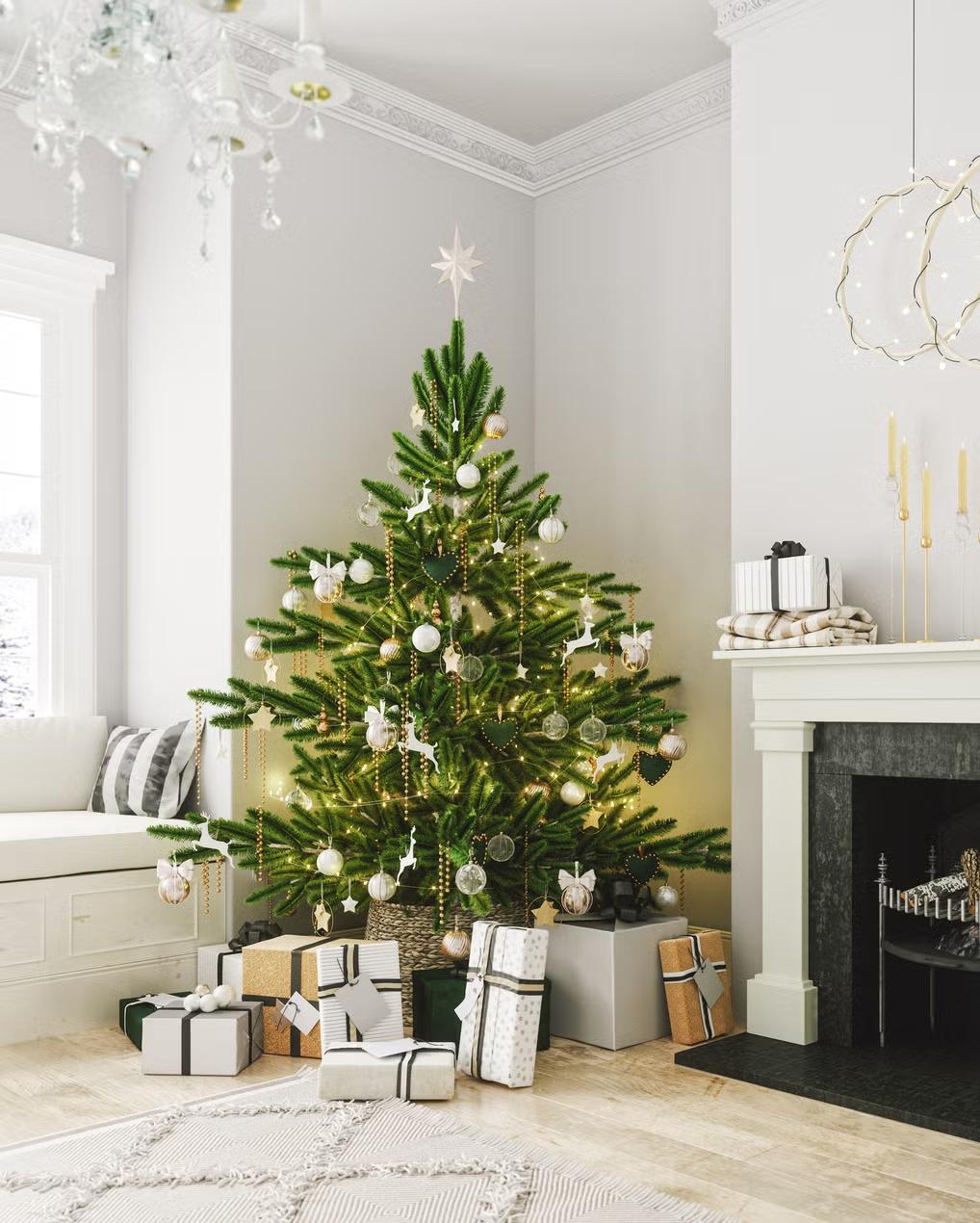 Традиционная красно-зеленая новогодняя палитра многим поднадоела. А вот белая новогодняя елка — это символ, который прошел испытание временем. Неважно, имитируете ли вы свежий снег на ветвях или используете белые украшения для контраста — не ошибетесь, используя белый цвет в рождественском декоре.