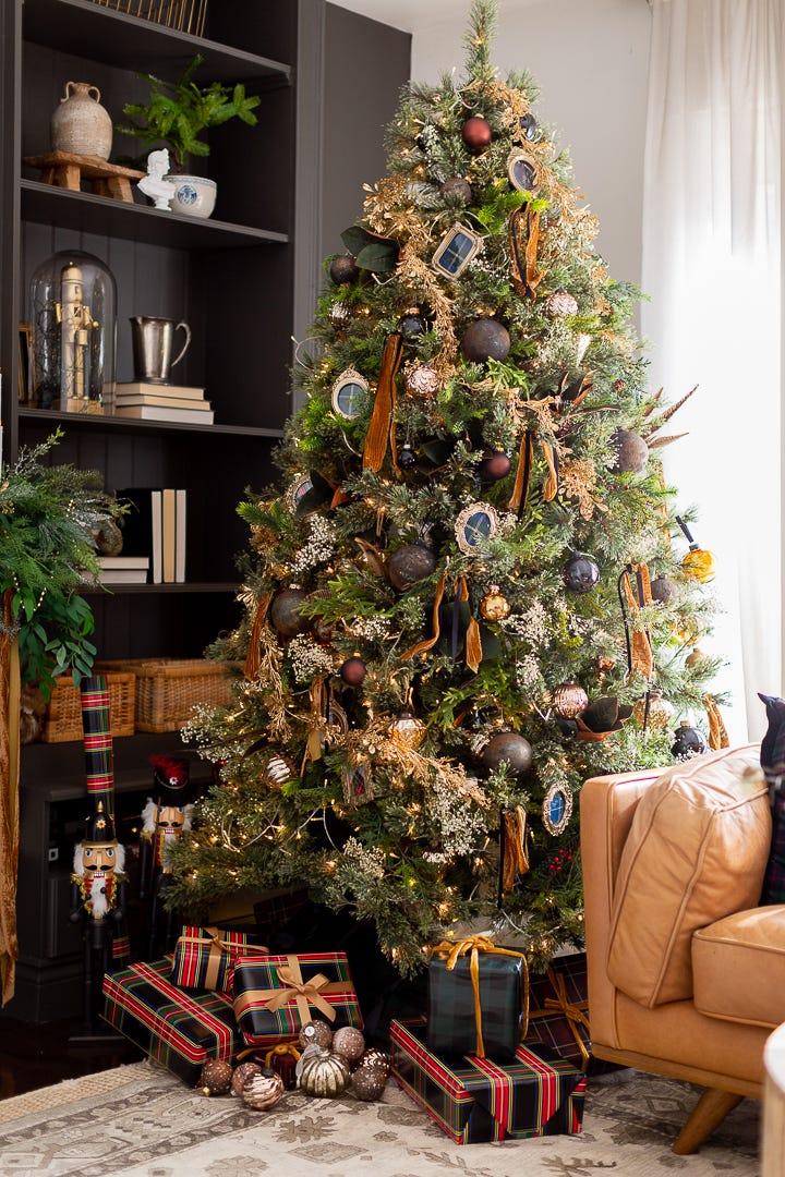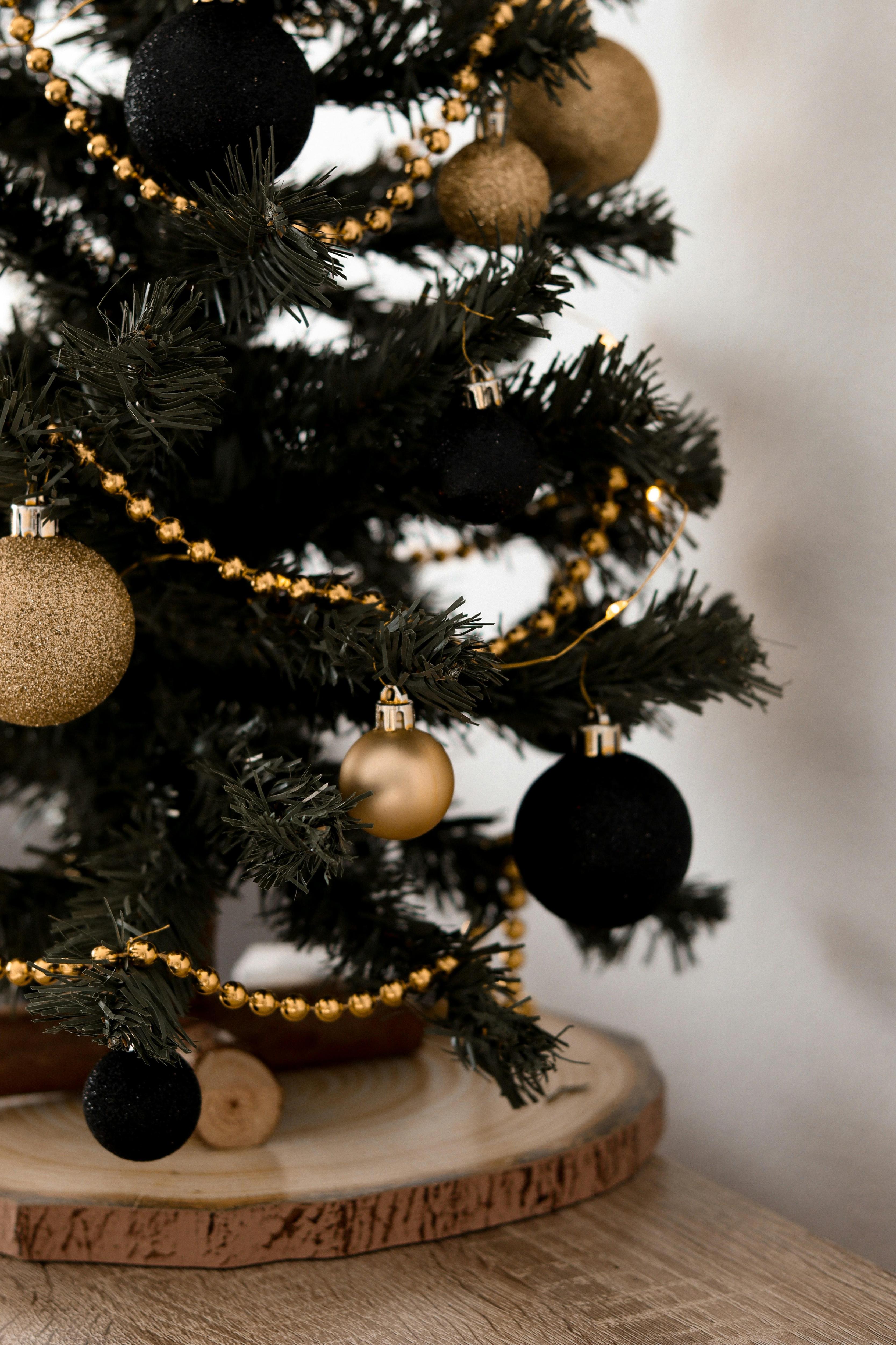 Комбинируйте матовые черные шары с бронзовыми подвесками в виде листьев, темно-зеленые шишки и ягоды. Добавьте текстуры с помощью бархатных лент и металлизированной мишуры цвета старой меди.