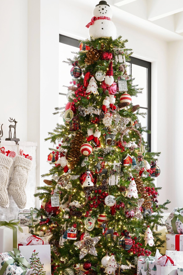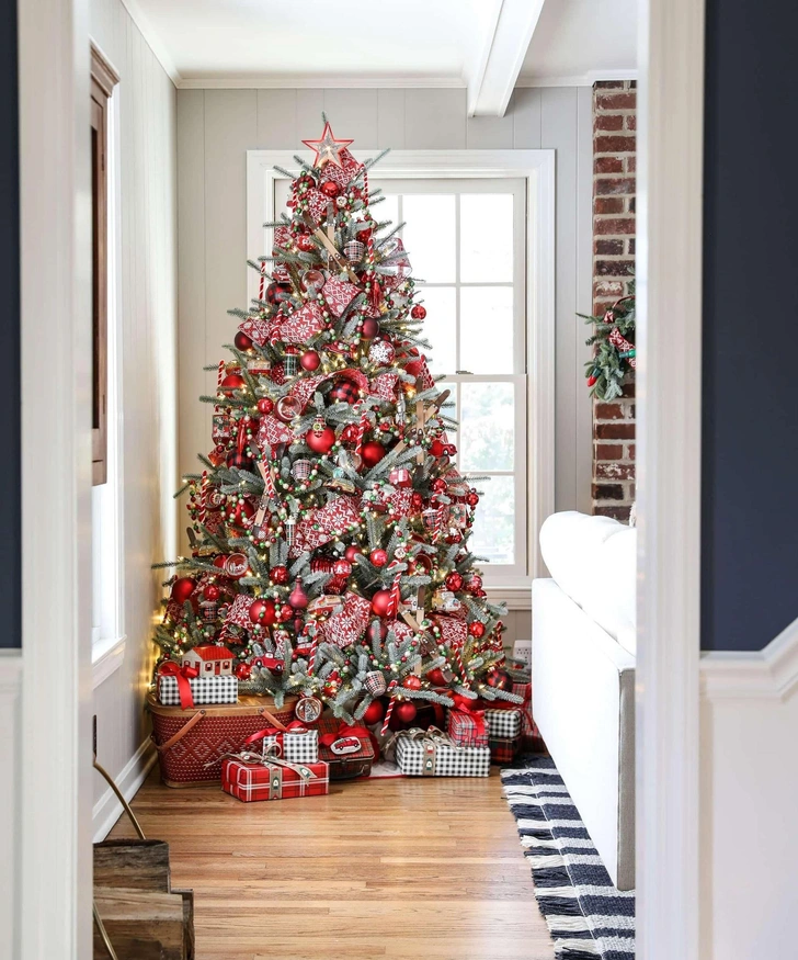 Проверенный временем вариант, который всегда работает. Красные шары, белоснежные снежинки, полосатые леденцы, ягоды падуба и белые гирлянды создают узнаваемый и самый праздничный образ. Современной ноткой может стать добавьте клетчатую ленту или деревянные игрушки.
