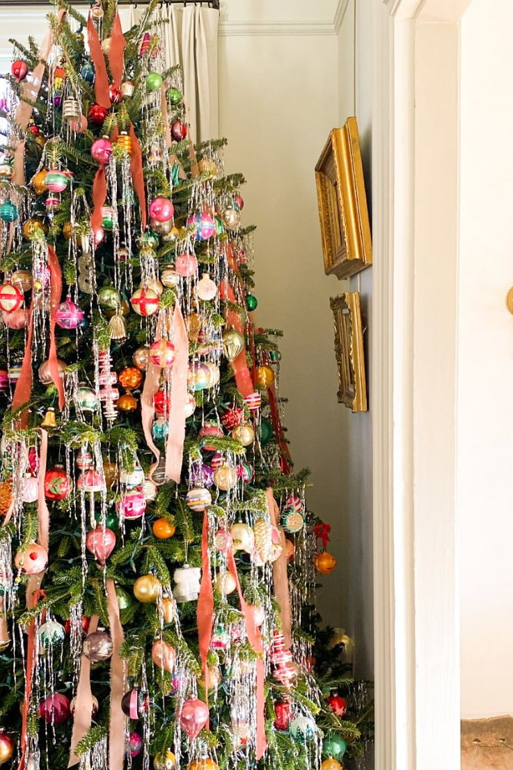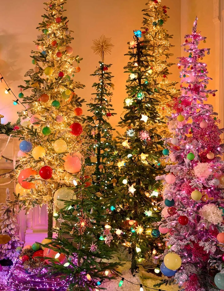 Характерные черты: елка серебристого или неонового оттенка, игрушки простых геометрических форм (шары, конусы, спирали) в контрастных ярких цветах (оранжевый, салатовый, фуксия), блестящая мишура и гирлянды с разноцветными лампочками.