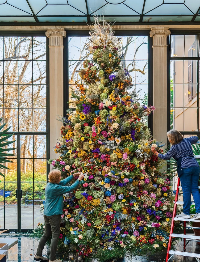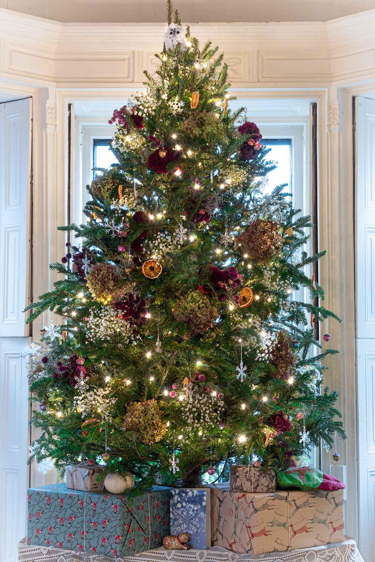Эта идея понравится тем, кто скучает по весне. Живую или искусственную елку можно превратить в цветущее дерево, используя искусственные соцветия. Крупные цветы, такие как гортензии или пионы, станут основой, а более мелкие — ромашки, незабудки — заполнят промежутки. Добавьте немного зелени для естественности.
