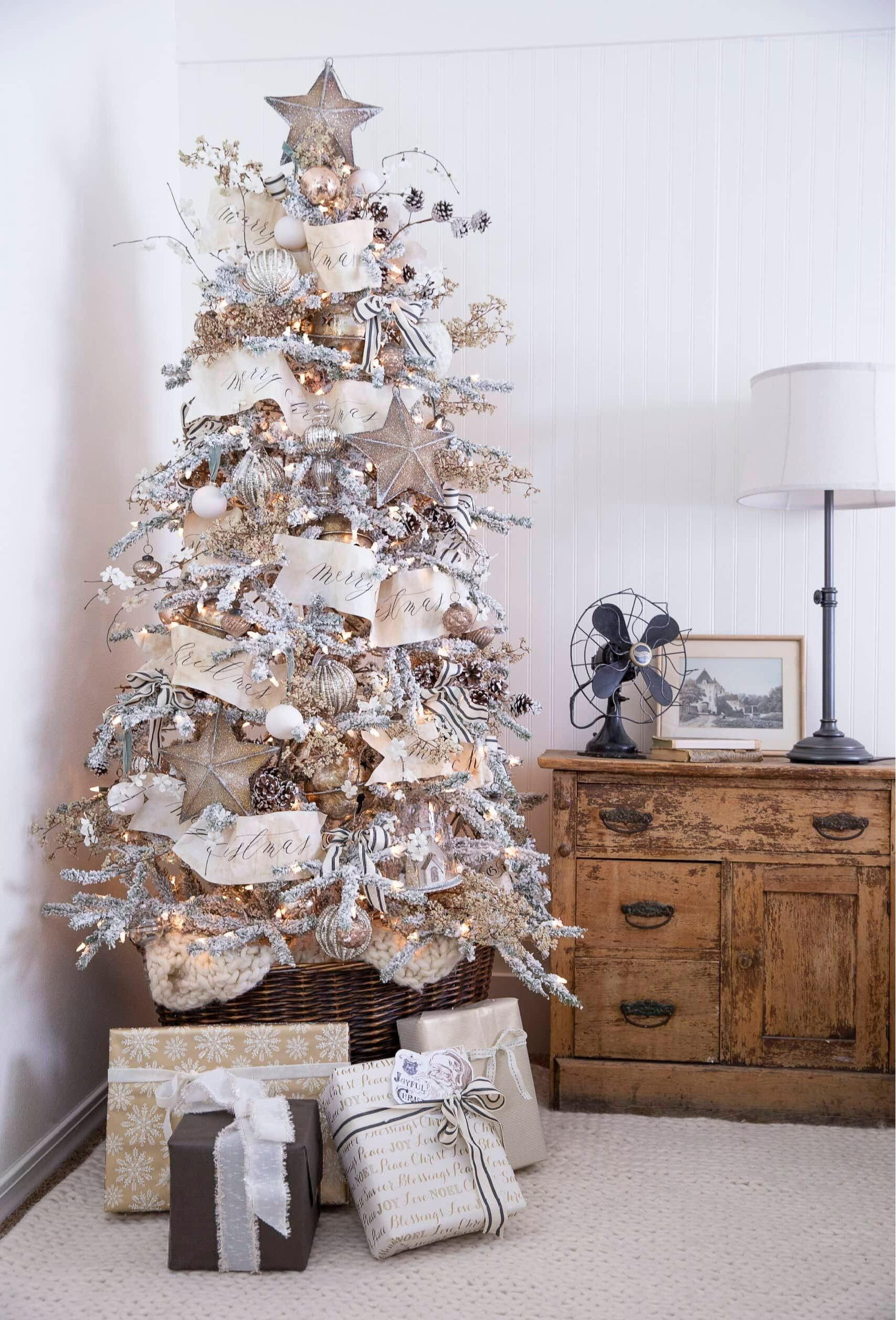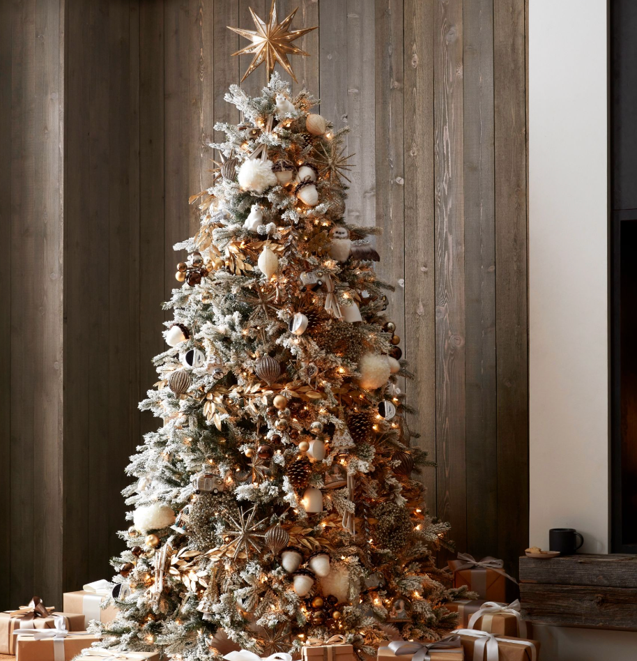 Имитация инея на ветках создает волшебное зимнее настроение. Для украшения такой елки используйте природные материалы и их вариации: шишки (как натуральные, так и искусственные), деревянные украшения в виде оленей и сов, ягоды падуба, а также игрушки из текстиля и войлока в натуральной цветовой гамме.