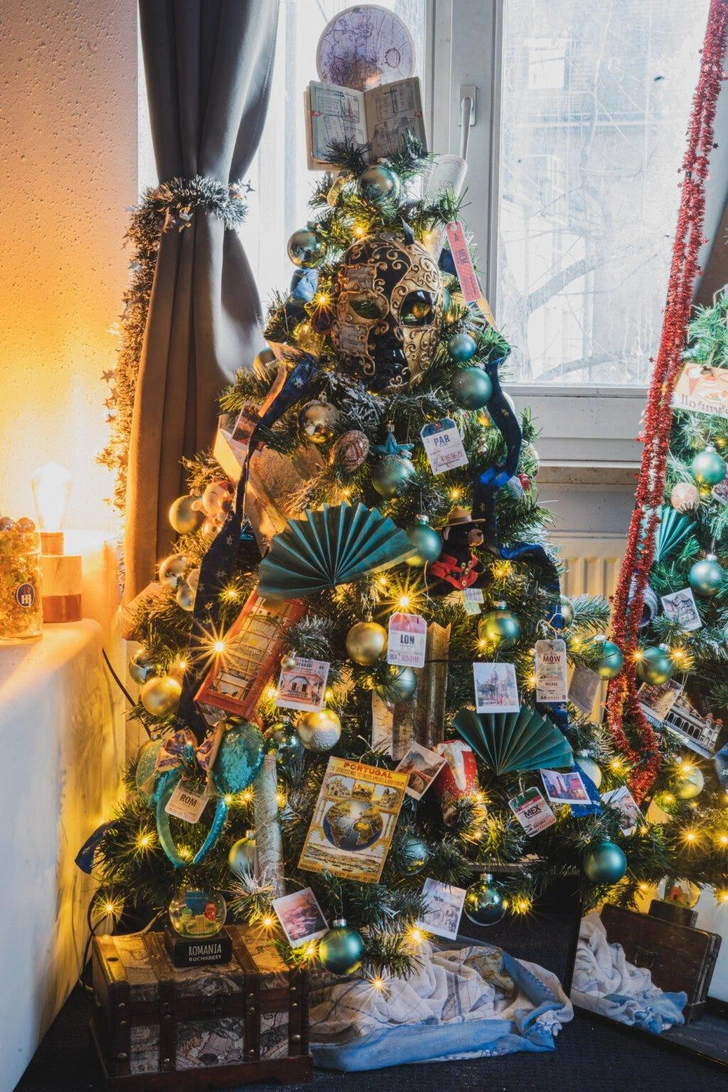 Каждый год можно добавлять на елку новый сувенир из путешествия. Это могут быть маленькие магниты на прищепках, билеты в театр или музей, монетки, миниатюрные национальные символы. Такая елка становится живой летописью ваших приключений.
