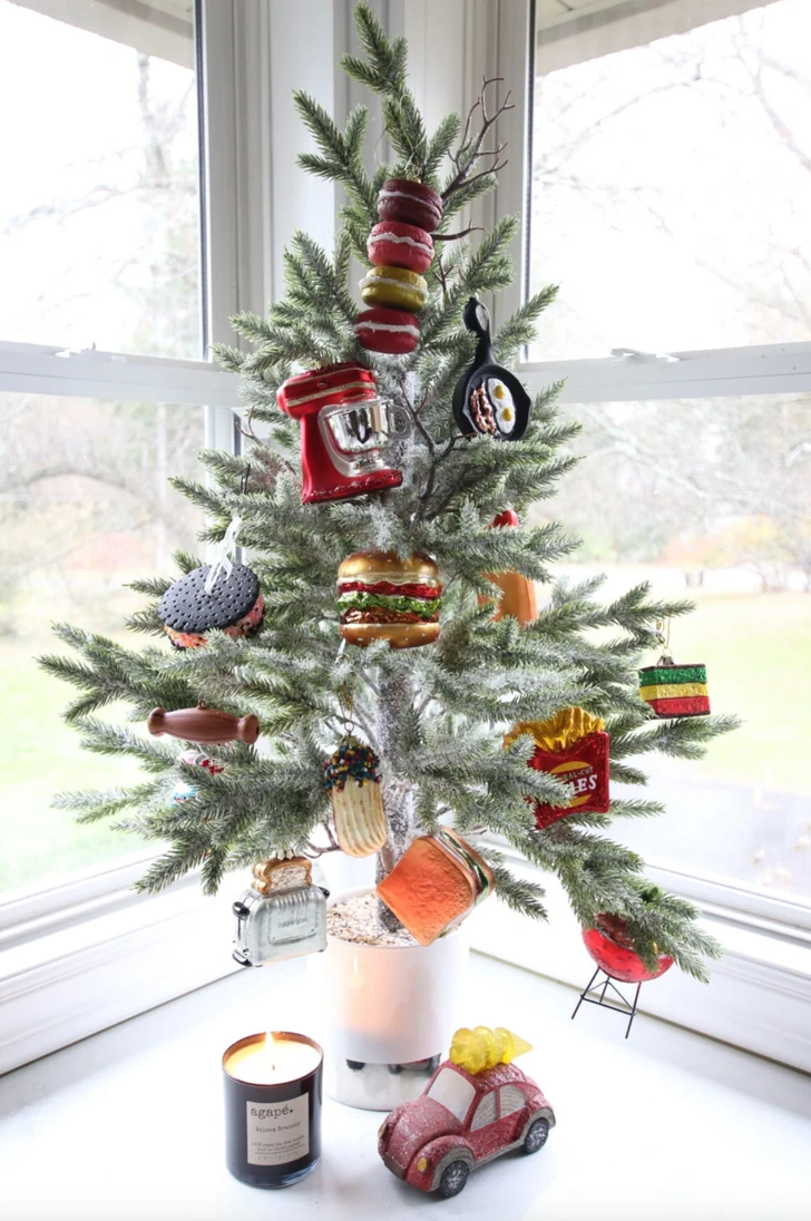 Небольшое деревце на кухне можно посвятить гастрономической теме. Идеи для украшений: миниатюрные керамические торты и пирожные, вязаные пончики и круассаны, деревянные ложки и скалки, фигурки кофейных чашек и даже крошечная сковородка.
