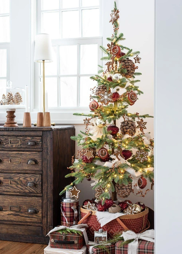 Эстетика кантри. Главные материалы — дерево, мешковина, шерсть, олово. Украсьте елку фигурками лесных животных, шишками, ягодами, маленькими фонариками и игрушками из грубой шерсти. Цвета — все оттенки коричневого, зеленого, бордового и белого.