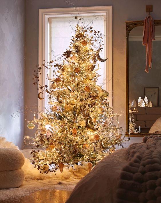 Луна, звезды, планеты и созвездия — главные мотивы этой темы. Используйте подвески в виде полумесяцев, фигурки астрологических знаков, гирлянды в виде звездного неба. Цветовая палитра — темно-синий, черный, серебро, золото и теплый желтый свет от гирлянды.