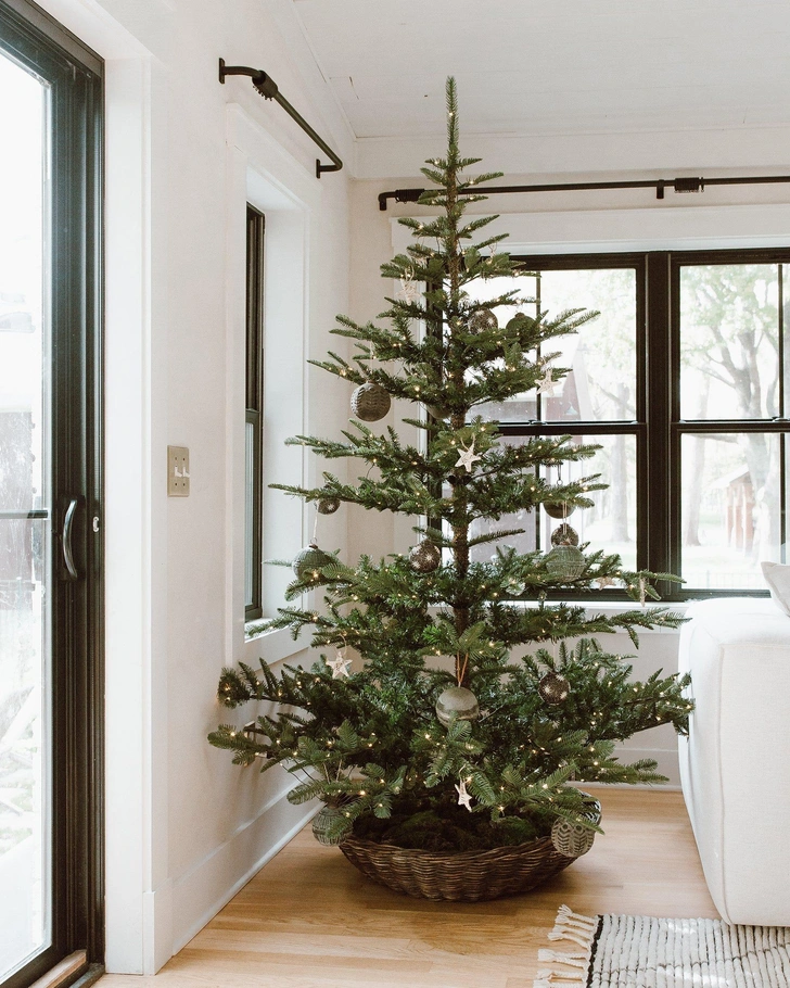 На живой или искусственной елке развешивают всего несколько украшений: одинаковые деревянные шары или фигурки, бумажные гирлянды, флажки из натурального льна. Освещение — только белая гирлянда, равномерно распределенная по ветвям.