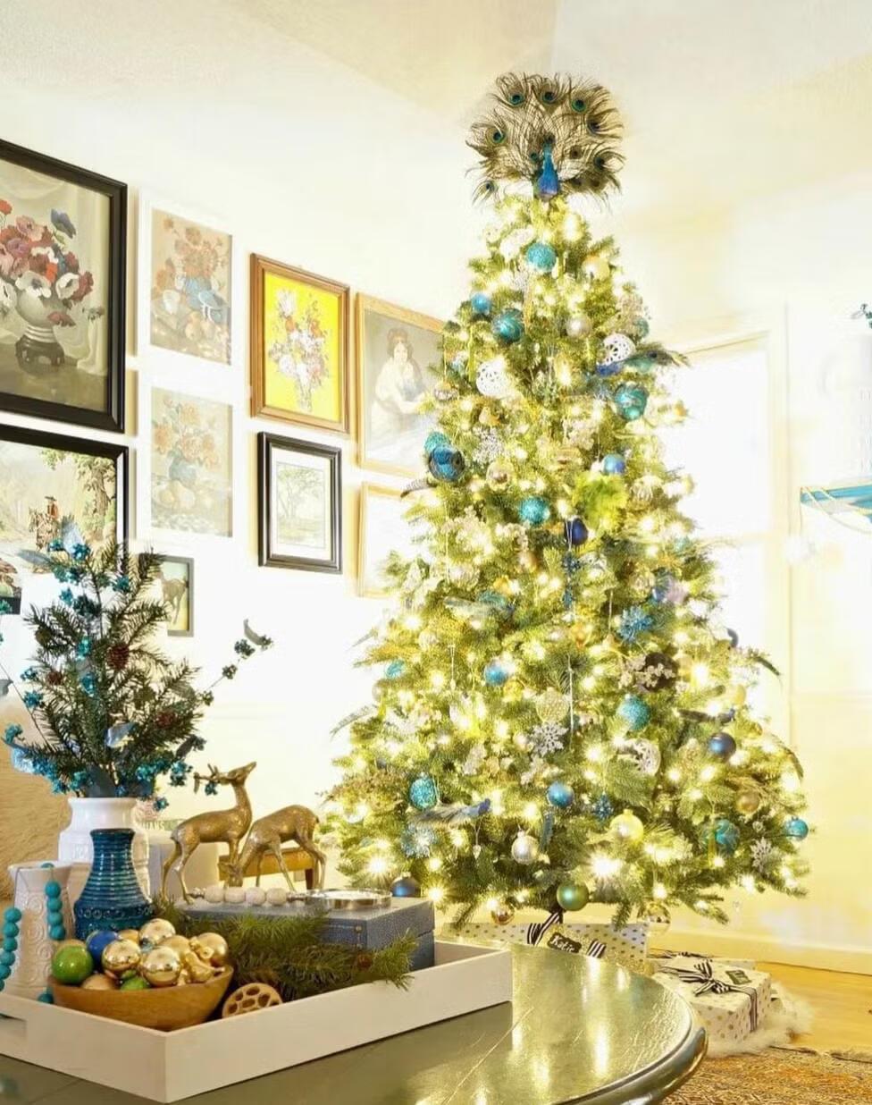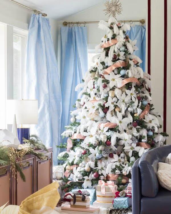 Вместо традиционных зайцев, овечек или лошадей повесить на елку игрушки на морскую тему. Для такого декора отлично подойдут елки с серебристым или синим отливом ветвей и бирюзовая палитра, а если вдруг хочется вариант поярче — можно использовать красные фигурки лобстеров или раков. Еще одна популярная тема из мира природы — украшение елки перьями и цветами. Их можно в брать в однотонном варианте или составить красочные композиции из нескольких оттенков, понасыщеннее или поспокойнее.