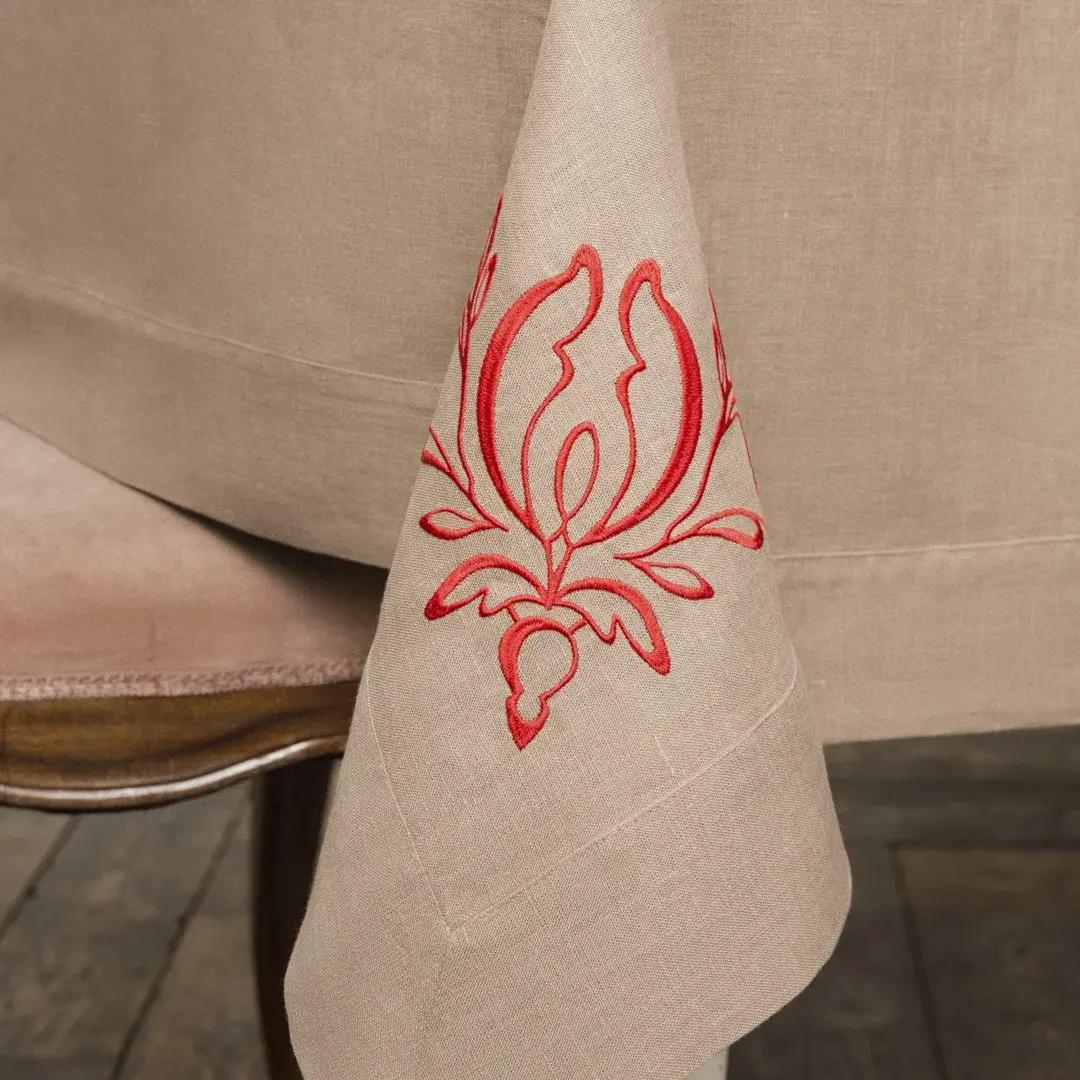 В коллекции отказались от яркой цветовой гаммы. Это сделано специально, чтобы подчеркнуть благородный монохром льна и вписать предметы коллекции в любой интерьер. Цветовая гамма декора представлена в трех вариантах: алый, черный и платиновый.