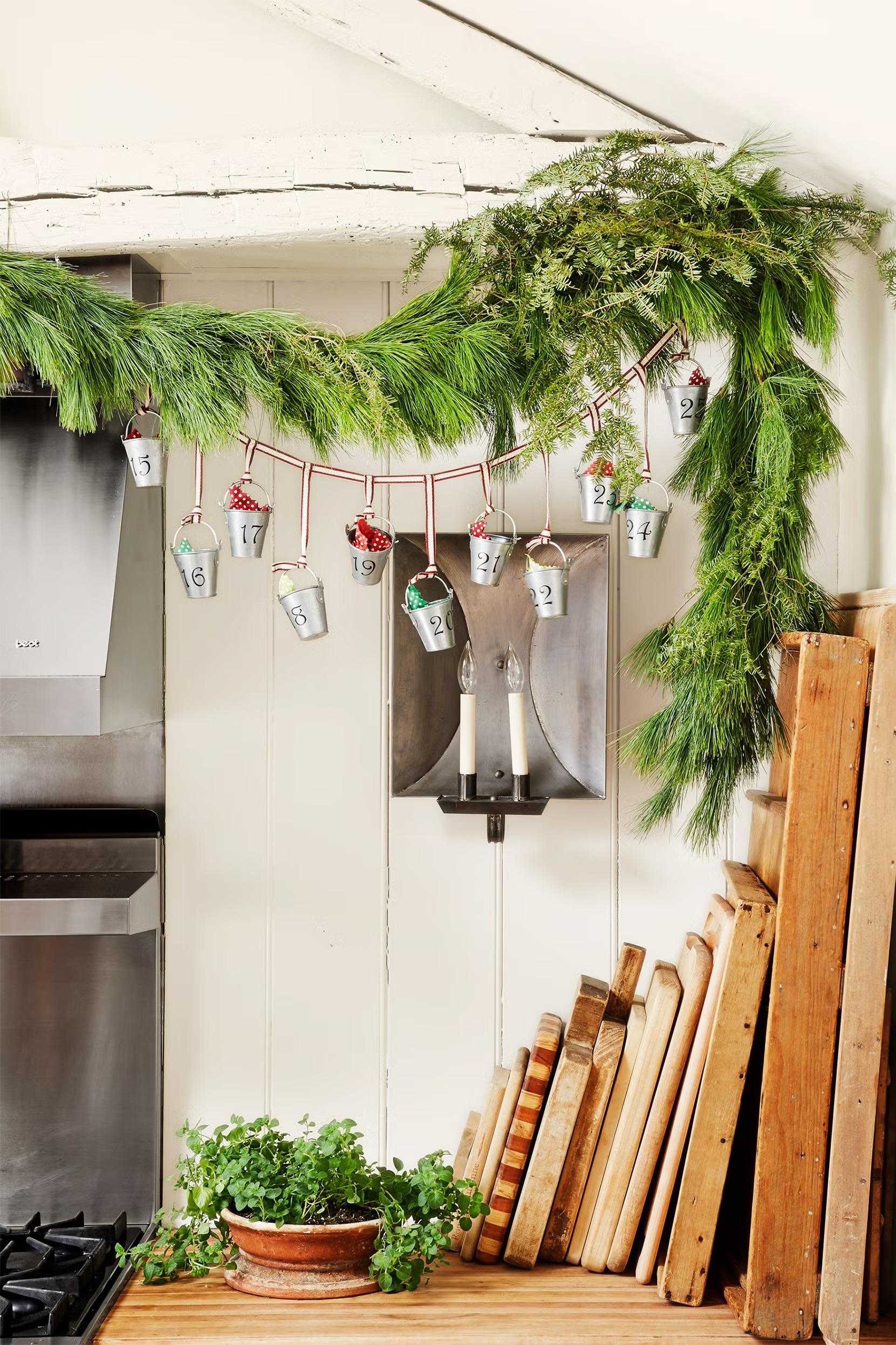 Подвесьте много маленьких ведерок на ленту, и у вас получится необычный адвент-календарь (и хорошая альтернатива новогодним носкам). Недавно у нас выходил материал про то, как сделать адвент-календарь — посмотрите.