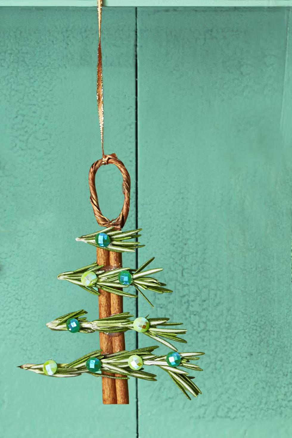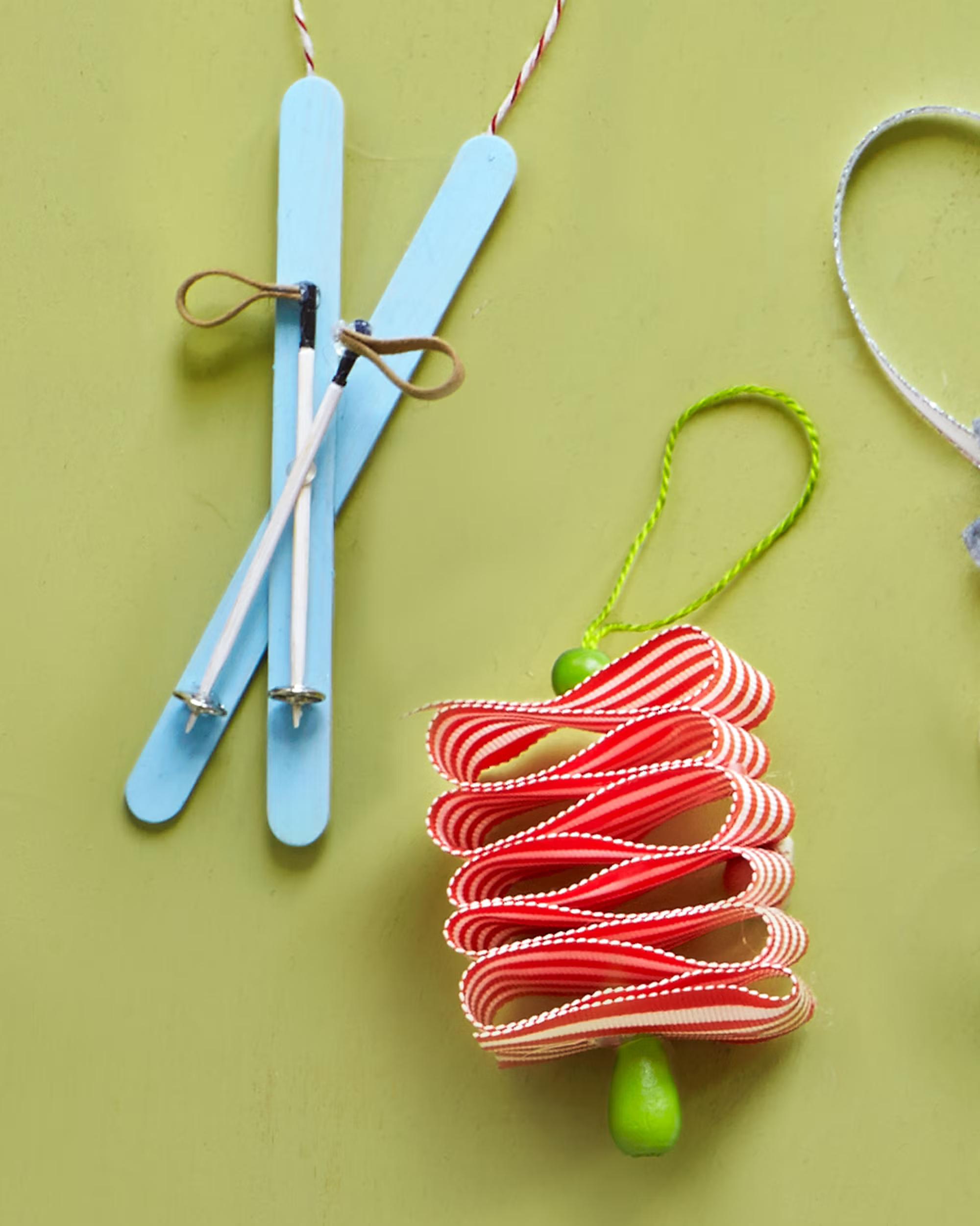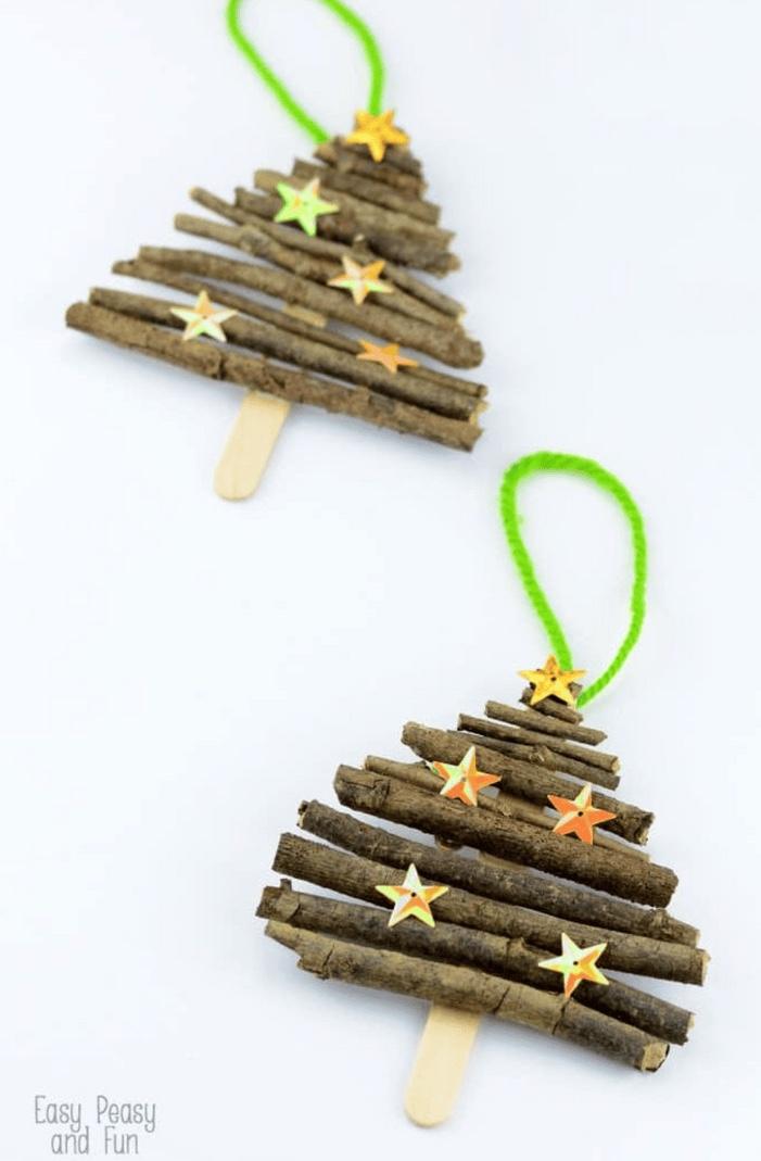 Наклейте несколько веточек на палочку от мороженого. В качестве украшений используйте звезды и прикрепите нить для подвешивания.