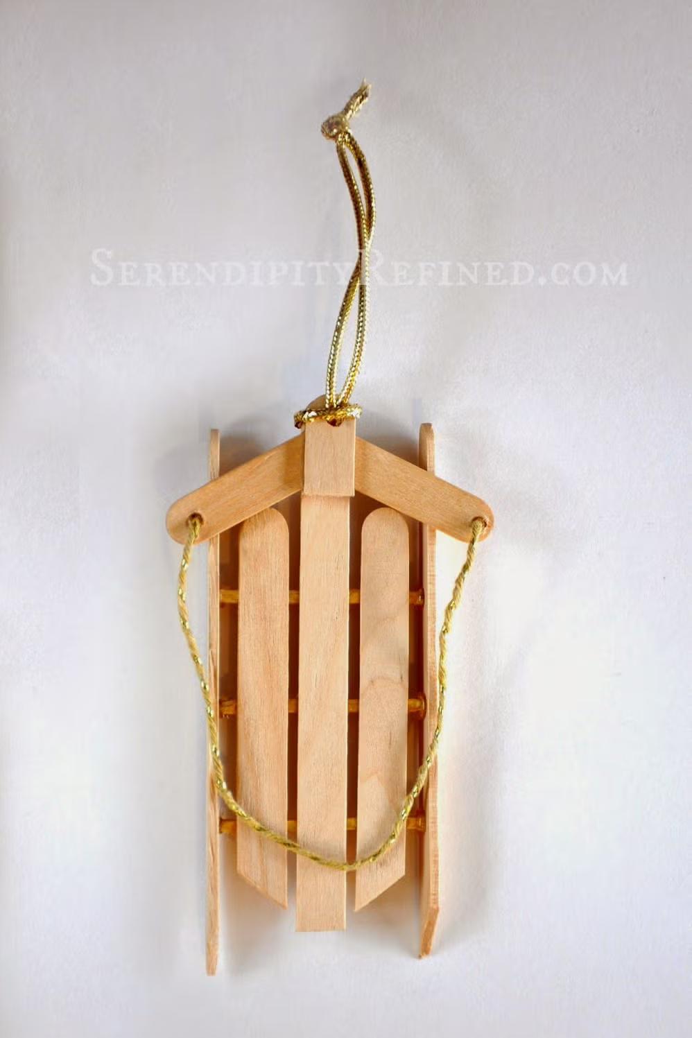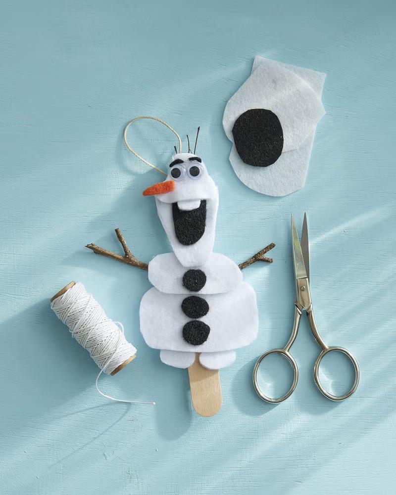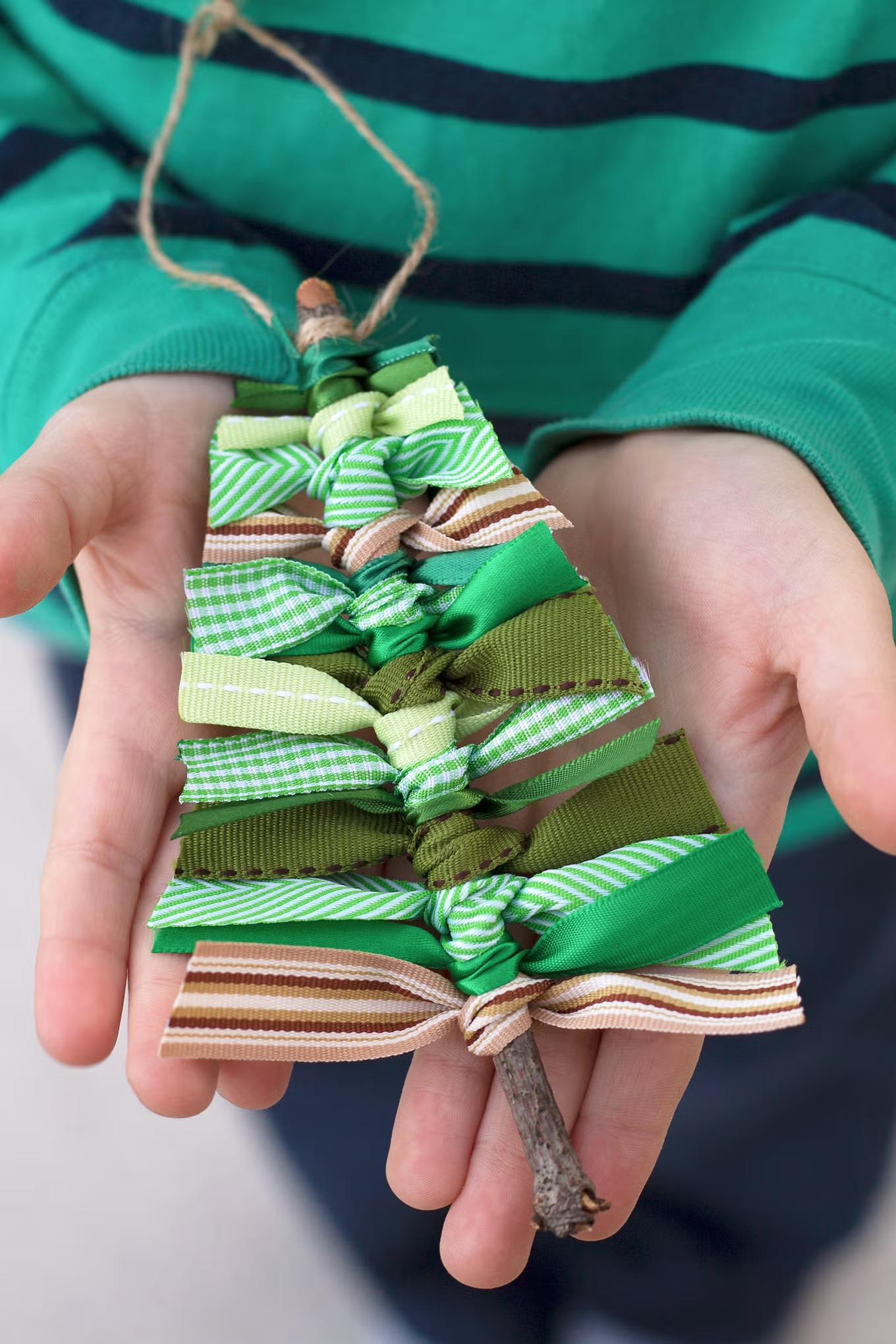 Наклейте несколько веточек на палочку от мороженого. В качестве украшений используйте звезды и прикрепите нить для подвешивания.