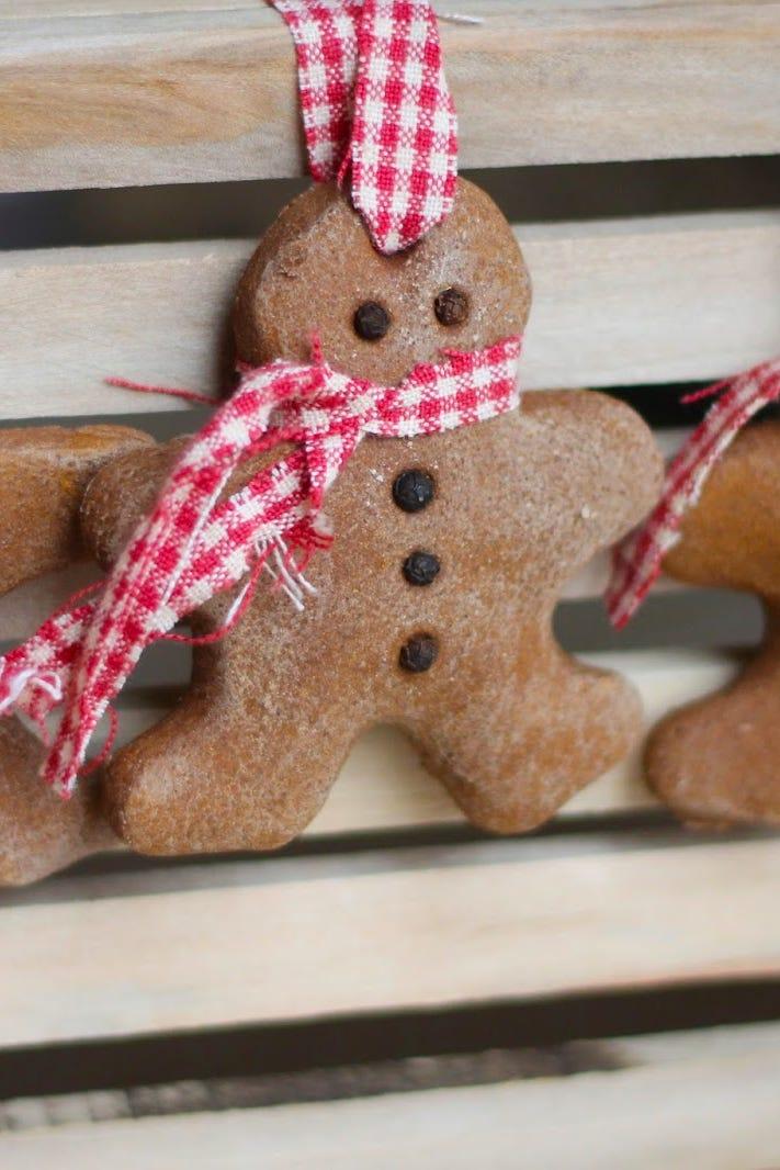 Украсьте имбирную основу симпатичным шарфом и подвесьте фигурки на ленты в тон. Такие игрушки не только красивые, но и приятно пахнут!