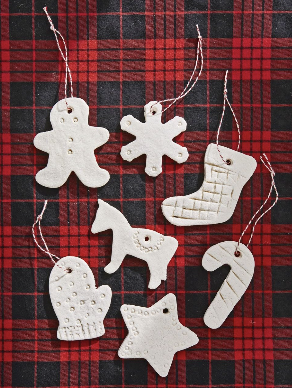 Ностальгический декор из детства — елочные украшения из соленого теста. Вам понадобится только мука, соль и вода. Замесив тесто, раскатайте его и вырежьте силуэты снежинок, снеговиков, варежек. Не забудьте предусмотреть дырочки для подвешивания фигурок!