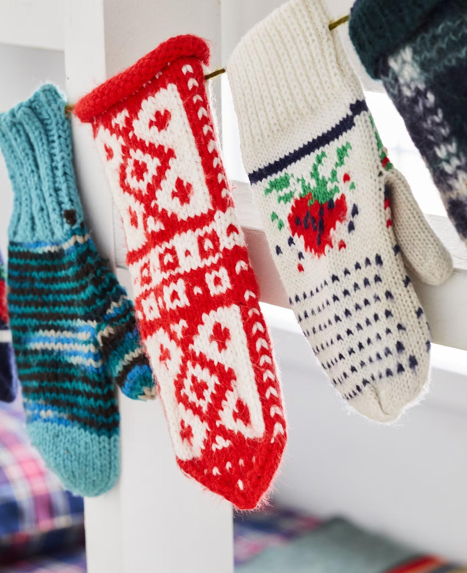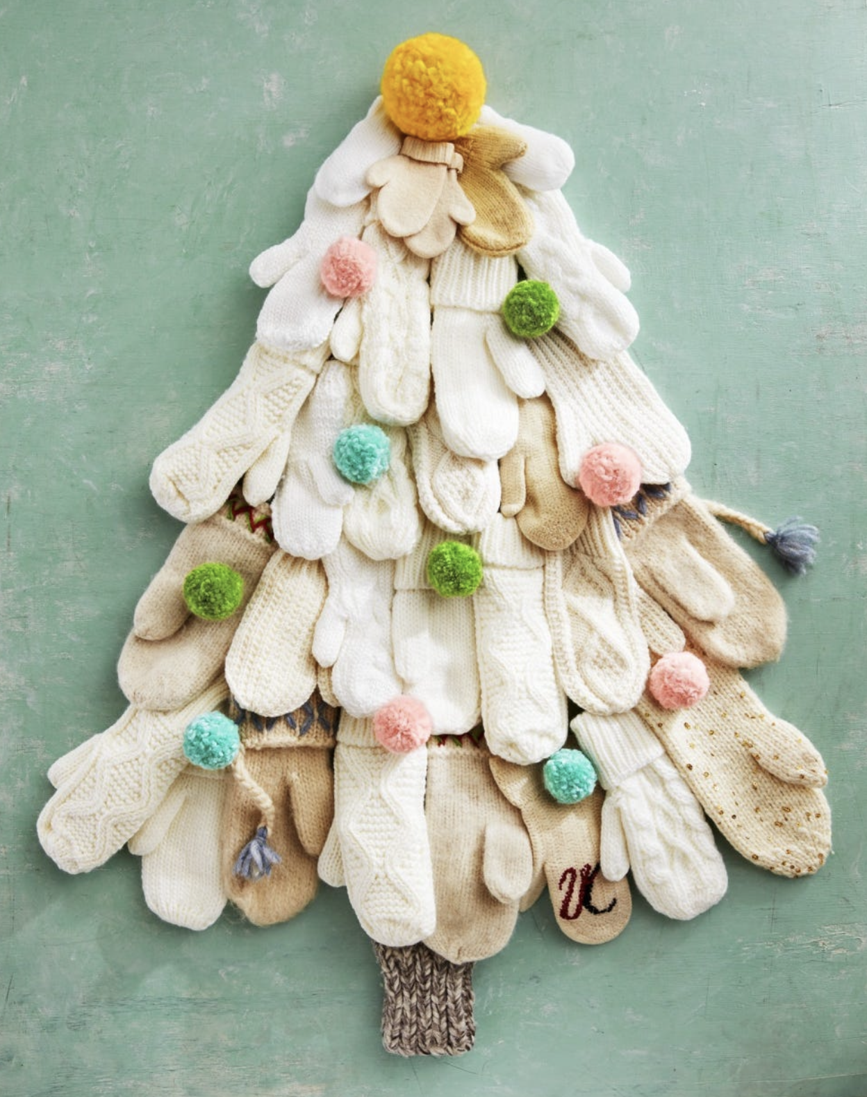 Из одиночных варежек можно сделать настенное панно в виде новогодней елки, украшениями послужат помпоны. С таким проектом справится даже ребенок!