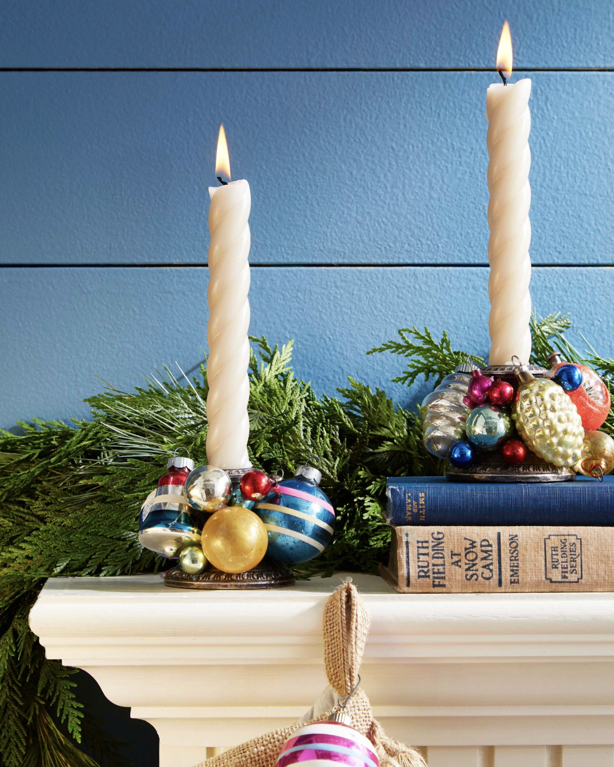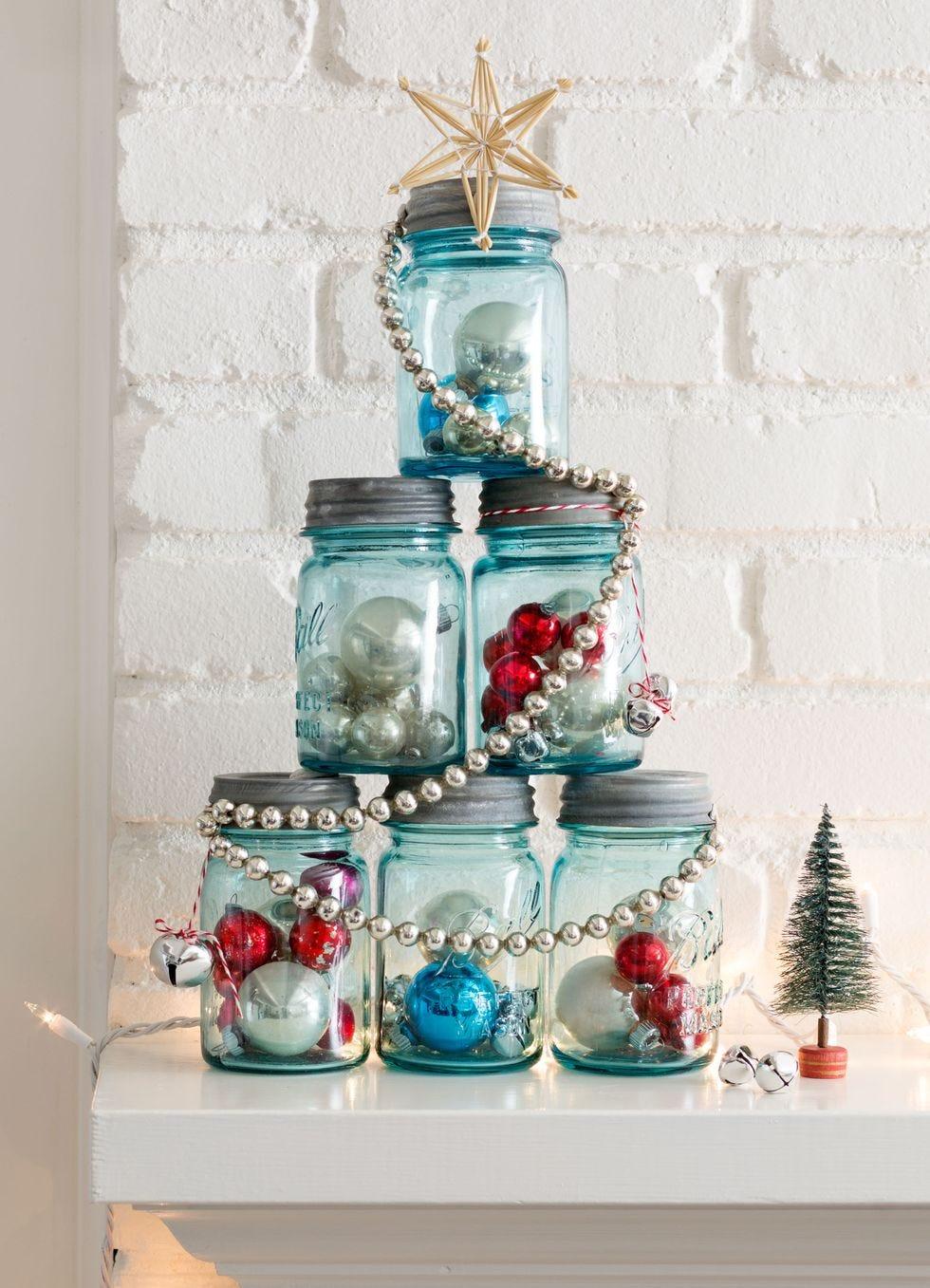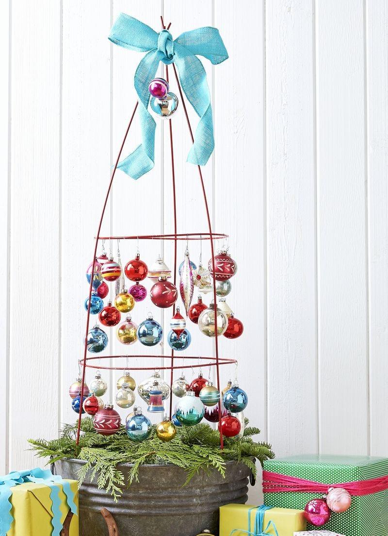 Эти сверкающие, яркие праздничные елки легко собрать из готовых конусов (их легко найти в любом магазине для хобби) и елочных игрушек, прикрепив их горячим клеем.
