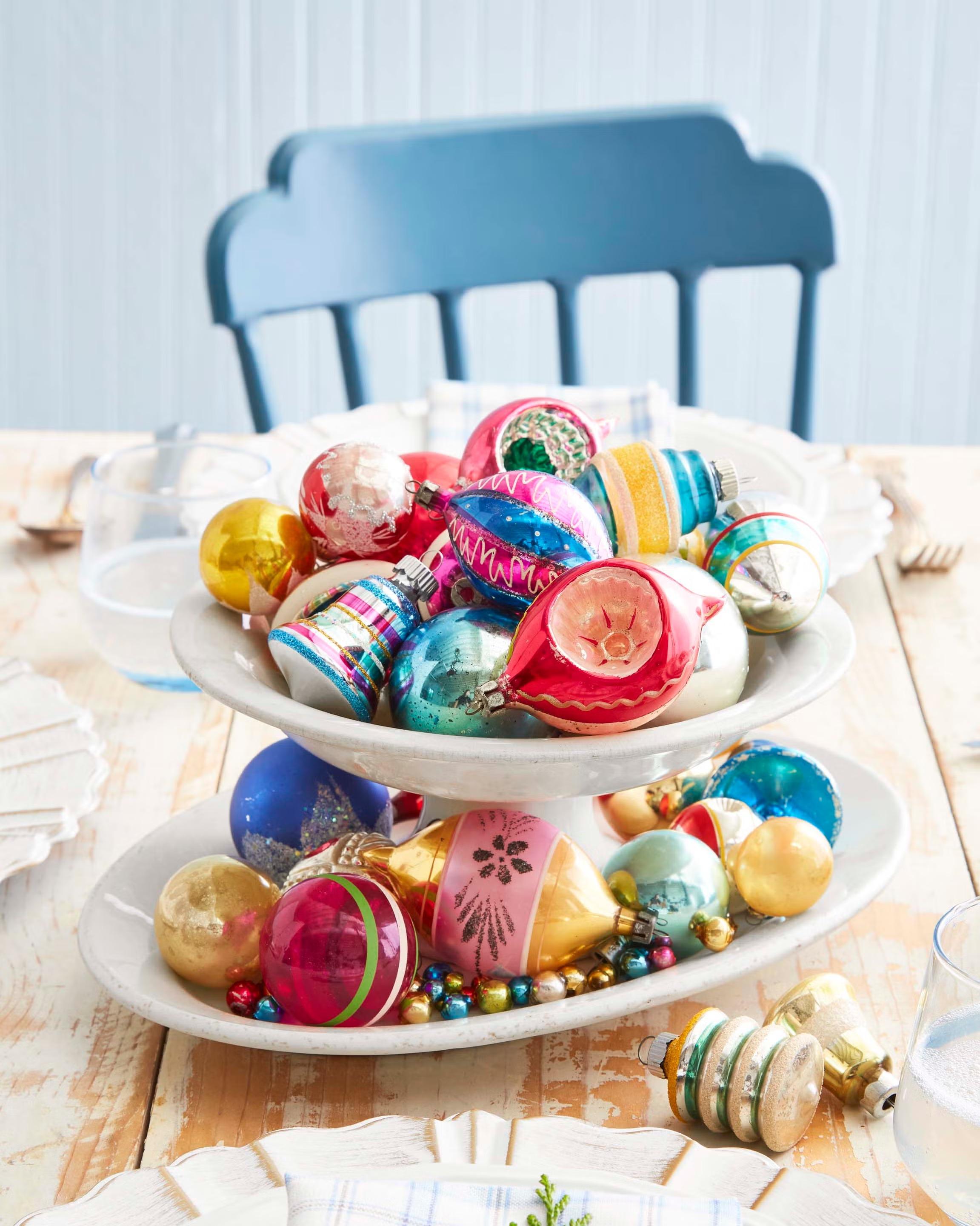 Начните с более крупных украшений в нижней части елок, постепенно переходя к более мелким. Пробелы можно заполнить миниатюрными шариками. При желании украсьте готовые елки винтажной мишурой и гирляндой из бисера