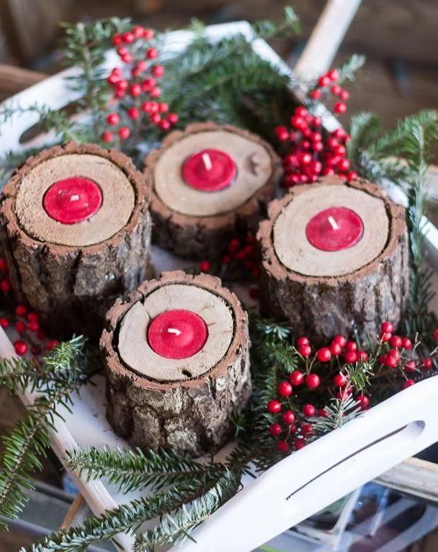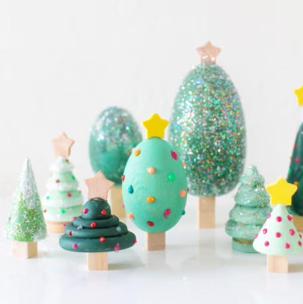 Деревянные заготовки можно быстро преобразить с помощью зеленой и белой акриловой краски, приклеить звездочки и бусины и покрыть блестящим лаком