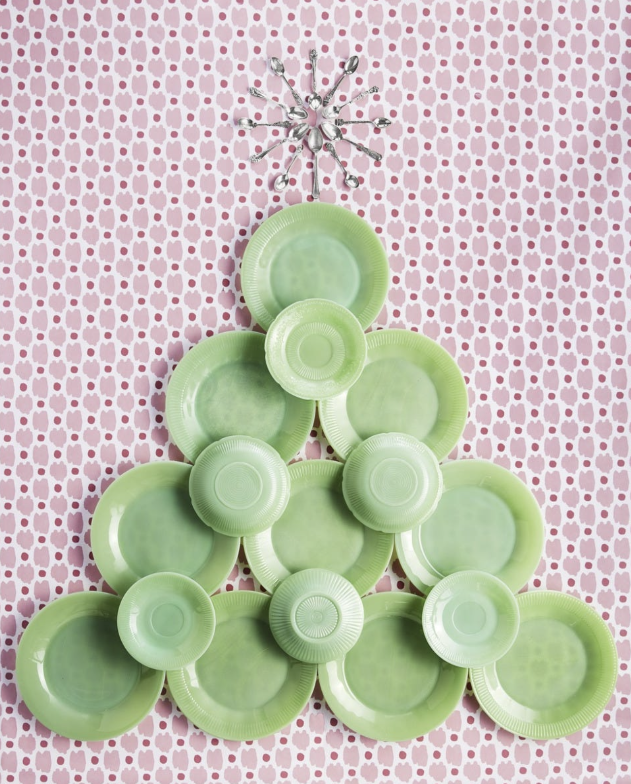 Еще один очаровательный и простой вариант на тему новогодней елки — стилизованное панно из тарелок, которые можно разложить на столе. Дерево может венчать звезда из ложек.