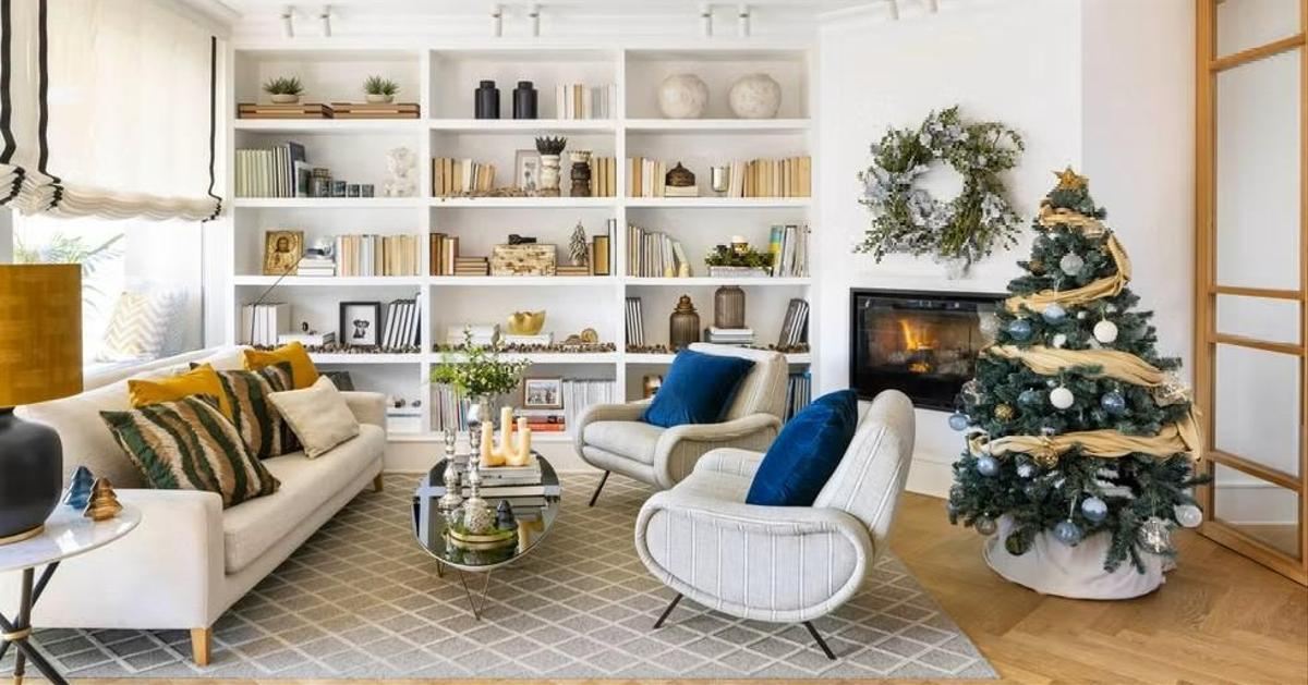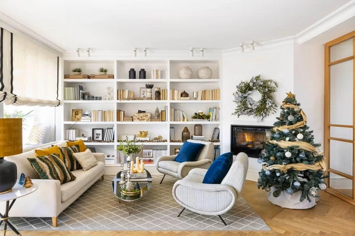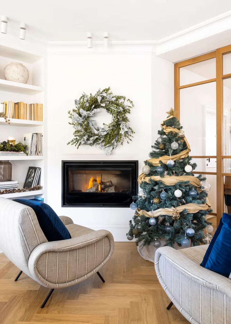 Новогодняя елкa, расположенная в гостиной, украшена игрушками в синих и серебристых тонах с легкими зелеными акцентами. Вместо стандартной гирлянды Ракель Гонсалес выбрала золотую тканевую ленту.