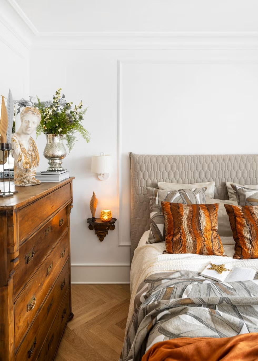 Например, в спальне Ракель заменила весь текстиль на кровати более насыщенными оттенками. В этом году она выбрала ткани терракотовых и серых цветов в сочетании с серебром и золотом, создав теплую и уютную праздничную атмосферу.