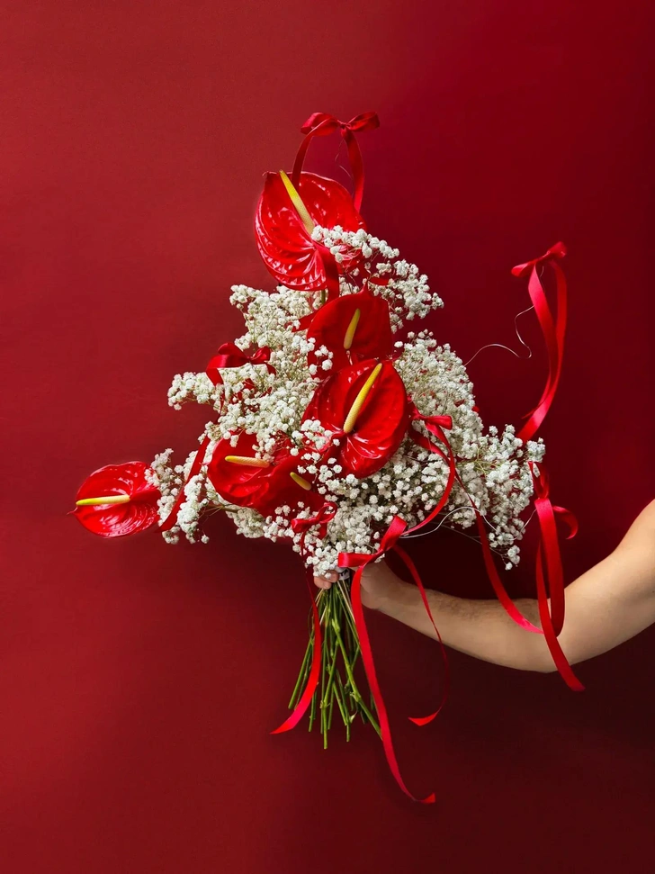 Можно сделать ставку на необычную композицию, например, как в букете с антуриумами, орхидеями и розами. Соедините в букете различные текстуры, насыщенные оттенки красного и скульптурные формы, приблизив его к арт-объекту. Такой вариант подойдет тем, кто воспринимает цветы как форму самовыражения и хочет удивить чем-то необычным.