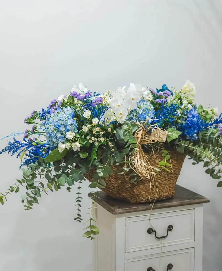 Если ваша половинка любите синий цвет, как небо или море, это беспроигрышный вариант. Такой букет можно составить из сезонных цветов синих, голуюых и белых оттенков, дополненных ветками эвкалипа, чтобы передать свежесть морского бриза и золотой свет лета. Для атмсферы можно собрать цветы в плетеную корзину, создав ощущение, будто они только что собраны на лугу или в поле.