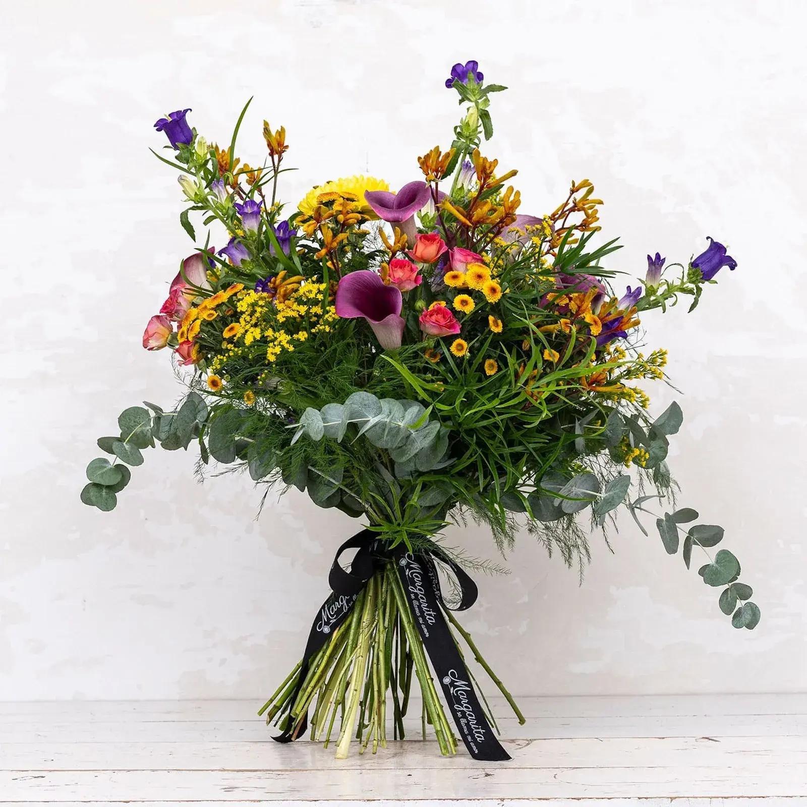 Составьте яркий букет из фиолетовых калл, фрезий оранжевых и фиолетовых оттенков, хризантем, маленьких розовых и оранжевых роз, обрамленных зеленью эвкалипта. Он отличается юношеским и дерзким шармом и подходит для активных и позитивных натур .