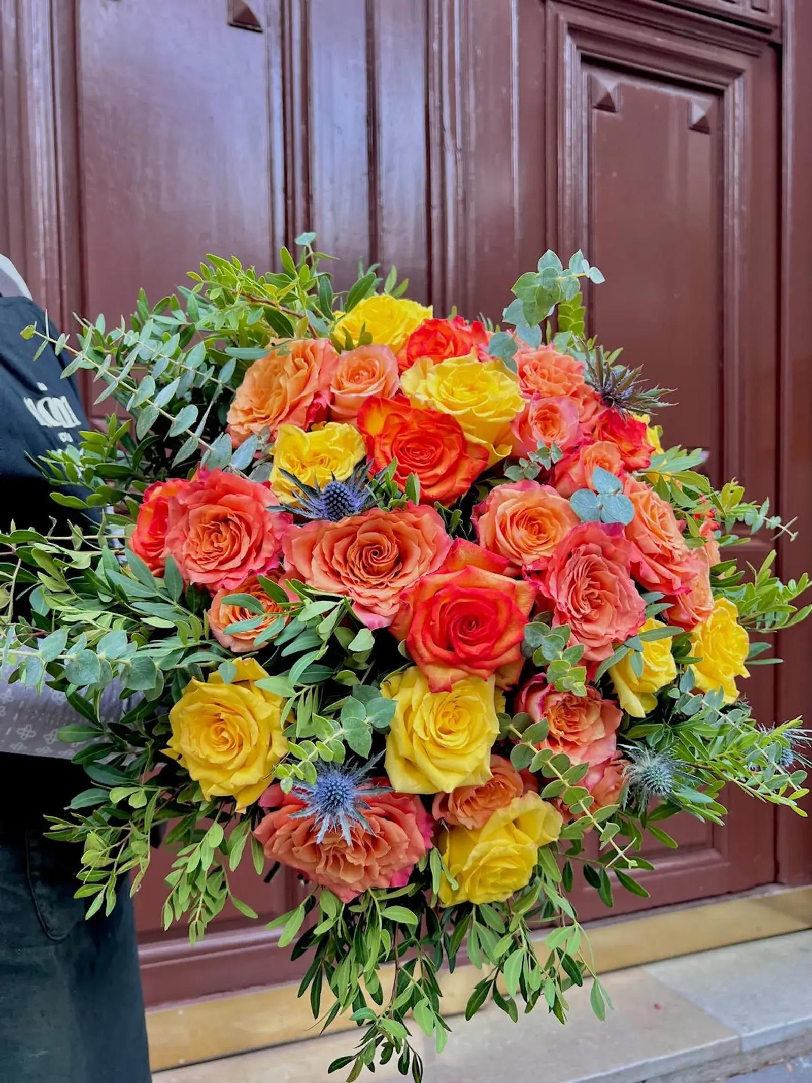 Традиционные красные розы заменены теплой и сияющей палитрой, собранной для тех, кто встречает любовь с радостью и оптимизмом. Золотистые, оранжевые и персиковые оттенки бутонов придают этому букету нежный и оригинальный вид.