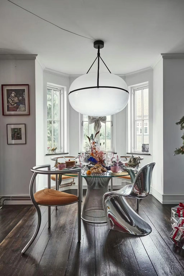 В эркере гостиной стоит обеденный стол Platner 1960-х годов от Knoll. Стол накрыт по традиции Южной Ютландии — для гостей в больших количествах приготовлена выпечка. «Самые теплые воспоминания у меня связаны с рождественским кексом и печеньем, которое называлось „Добрый совет“. Помню, как мама стояла со старой чугунной сковородой и пекла целые стопки печенья, которые мы ели весь декабрь. Теперь я делаю то же самое, и печенье исчезает слишком быстро», — говорит Сесилия.