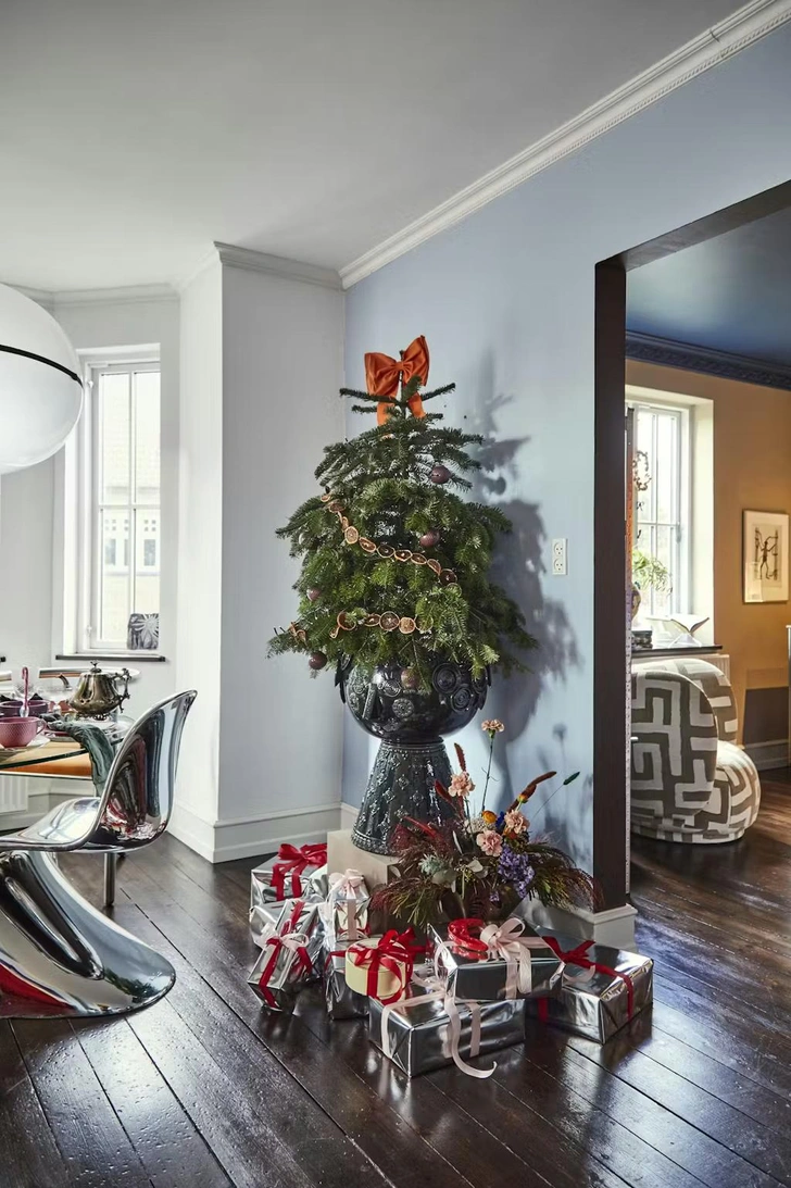 Новогодняя елка поставлена в большую фаянсовую вазу «Симфония Кармен» от Bjørn Wiinblad. Она украшена довольно просто: сушеными апельсинами на веревочке, темно-фиолетовыми рождественскими шарами и большим оранжевым бантом сверху. После праздников Сесилия посадит это дерево в своем саду.
