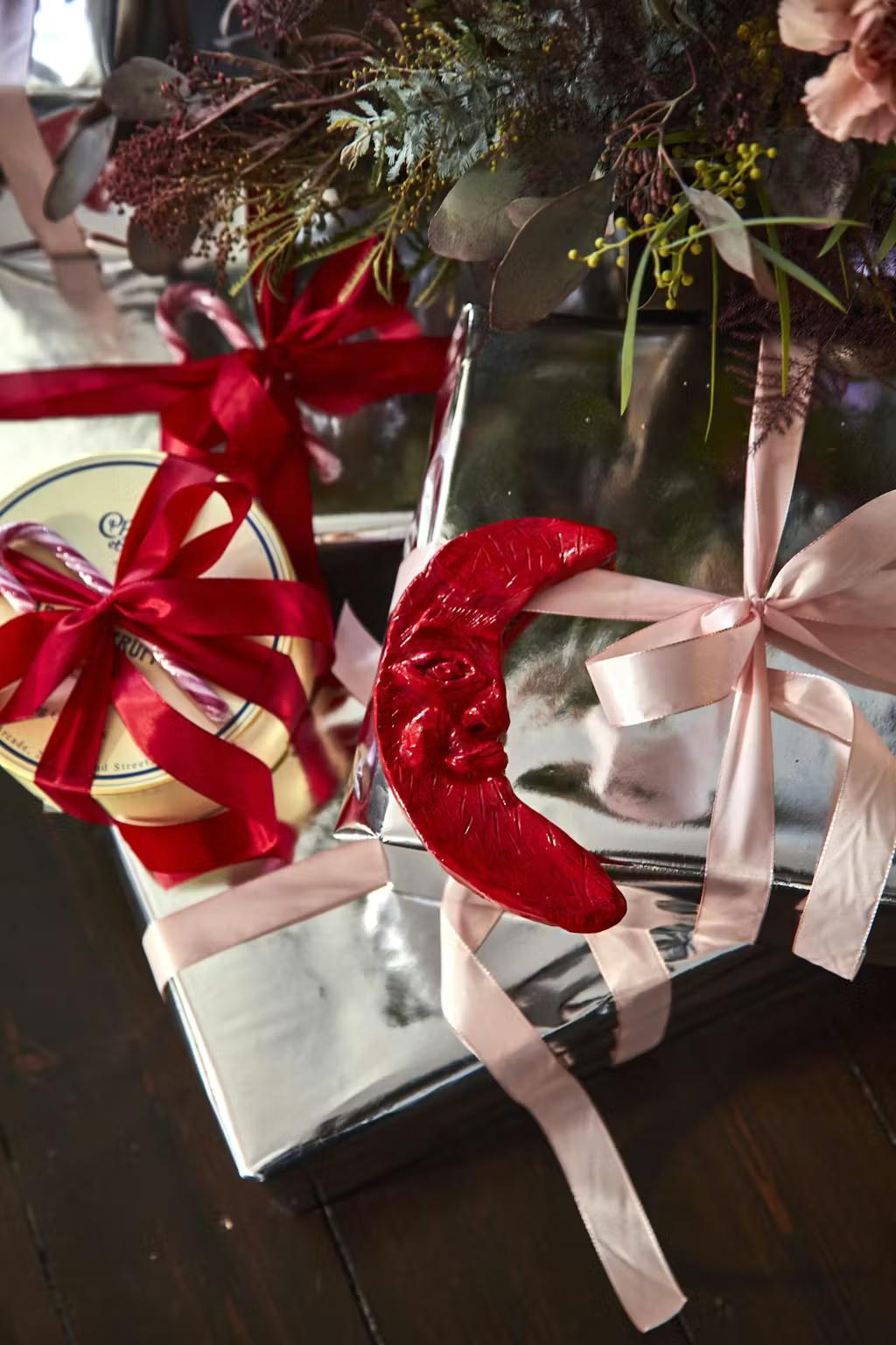 Подарки под елкой завернуты в серебристую бумагу с красными и розовыми лентами. Блестящая поверхность подарочной бумаги гармонирует с обеденным столом и стульями, создавая ощущение спокойствия — и позволяет использовать красочные элементы в сервировке стола. Например, Сесилия сама сделала яркое лакированное украшение в в иде красной луны из самозатвердевающей глины.