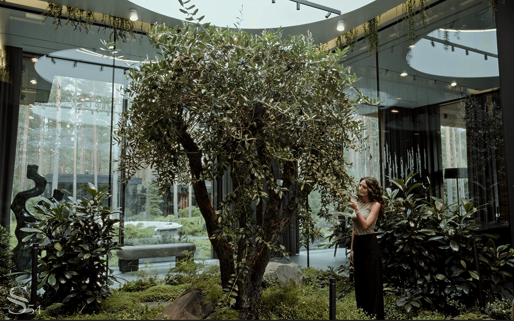 В другом проекте в Ленинградской области центральным элементом стал зимний сад с оливковым деревом, доставленным из Италии. Чтобы олива долго радовала хозяев, установили специальные инженерные системы для поддержки микроклимата внутри куба: автоматический полив, кондиционирование, увлажнение и осушение воздуха, продуманное освещение и вентиляцию. Все это еще и подключено к системе умного дома.