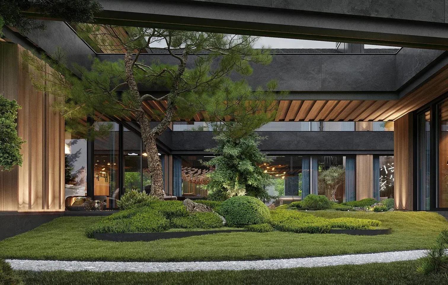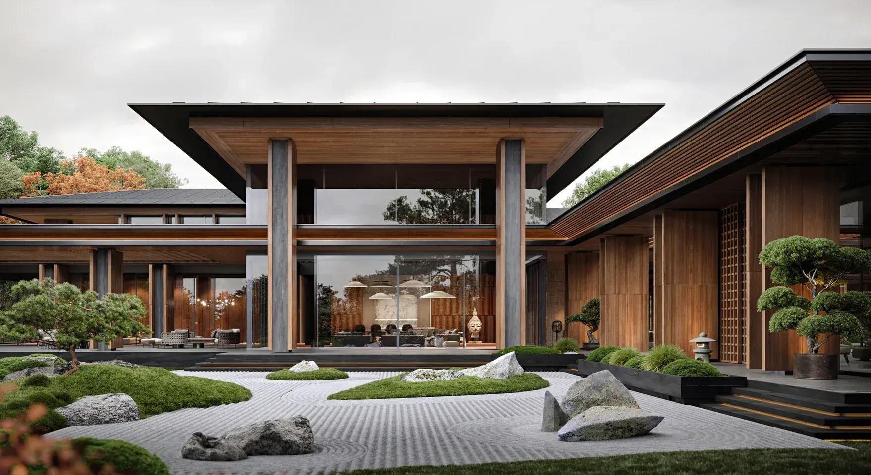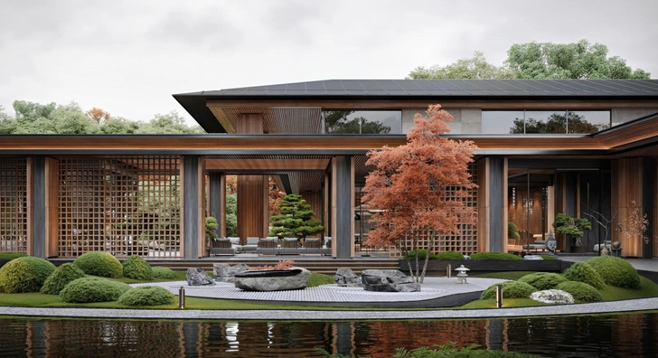 На территории дома сделали японский сад в виде «сухих ручьев» из гальки и сада камней. Водную гладь перед парадным входом декорировали инсталляциями в виде кувшинок, символизирующими в Японии спокойствие и непорочную красоту. К основному зданию добавили пристройку для чайных церемоний и использовали национальные деревянные ширмы. Во внутреннем дворике среди зеленых насаждений жена заказчика сможет насладиться прогулками по саду и почувствовать близость к своей родине.