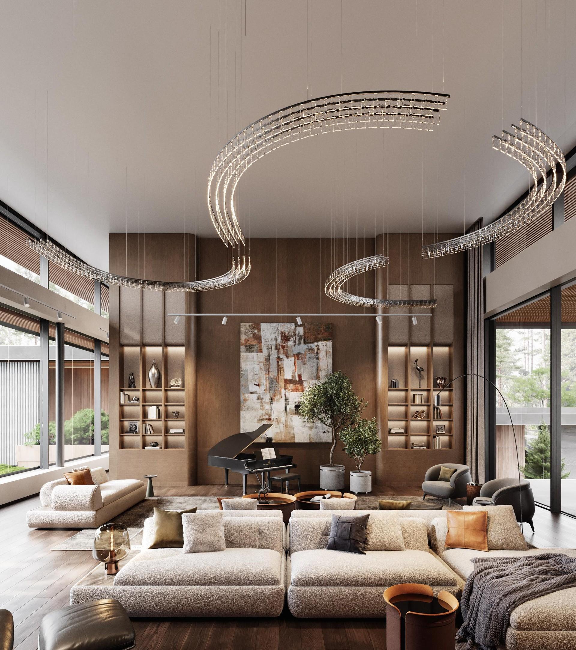 В архитектуре важна не только форма. Ощущение свободы и простора легко создать в домах с открытыми планировками. В пространстве одна зона плавно перетекает в другую, а естественный свет и воздух свободно циркулируют внутри помещения. Воздушность интерьеру также придают световые инсталляции.