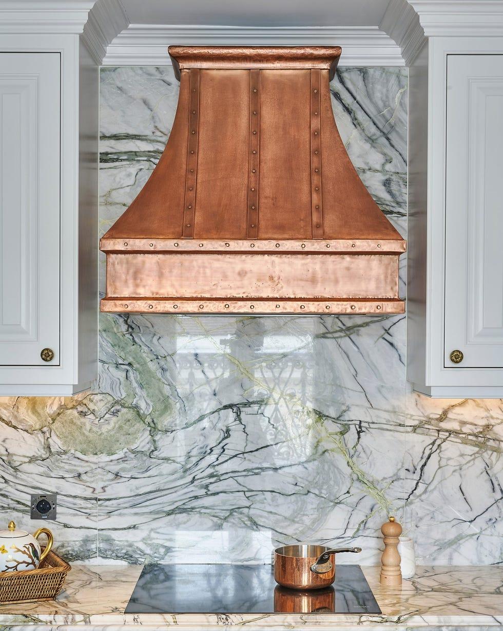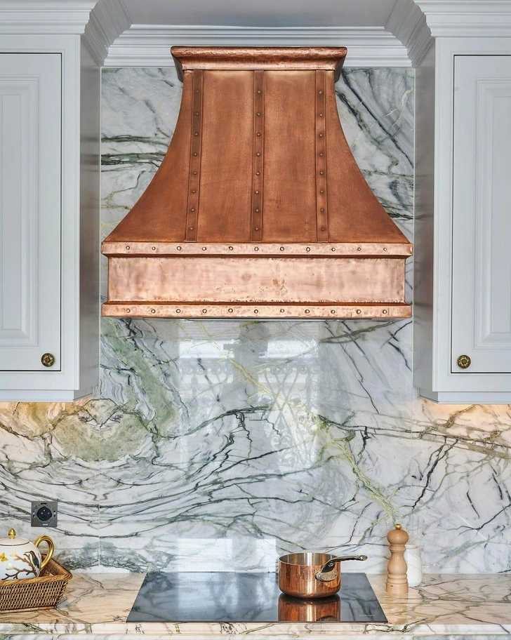 В самых стильных французских кухнях всегда встречаются медные детали. Причина кроется в богатой национальной истории этого материала. На традиционной провансальской кухне часто можно увидеть медную посуду, выставленную под каменной вытяжкой. Кроме того, со временем на меди появляется красивая патина.