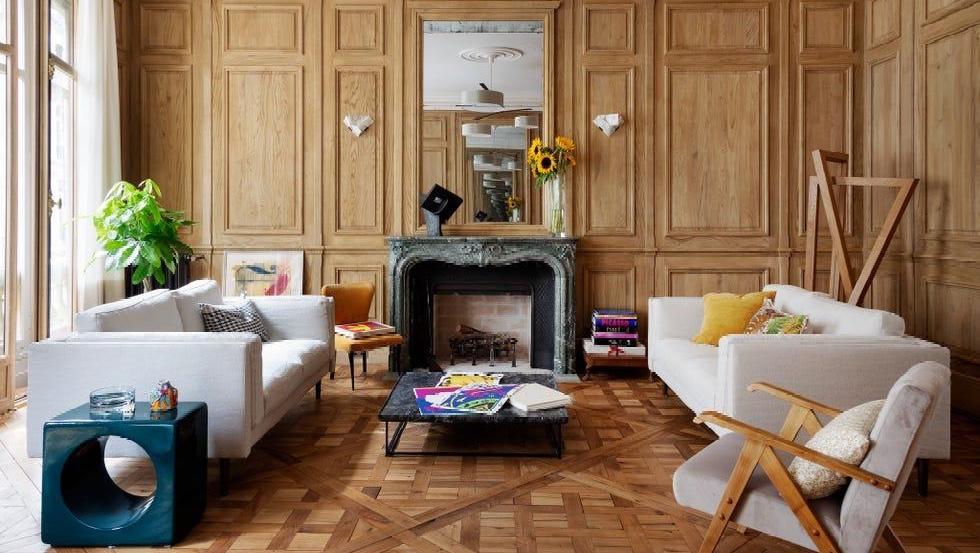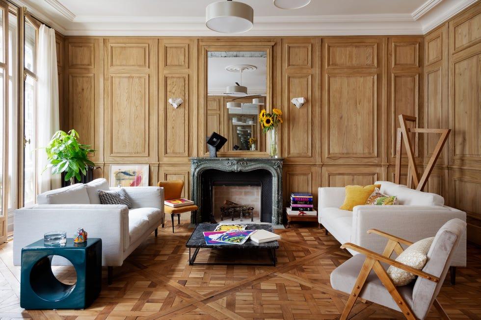 В гостиной квартиры XVII века в Сен-Жермен-де-Пре дизайне Бетси Каша отдала дань истории традиционнных буазери, покрыв все стены резными дубовыми панелями.