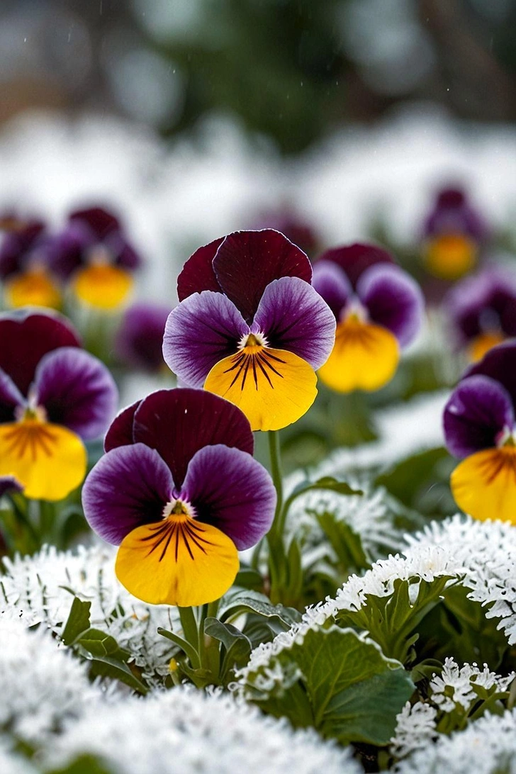 Для красивого зимнего сада можно рассмотреть еще несколько вариантов растений. Ярких акцентов добавят зимние анютины глазки, фиалки, примулы, полиантовые розы и декоративные маргаритки.