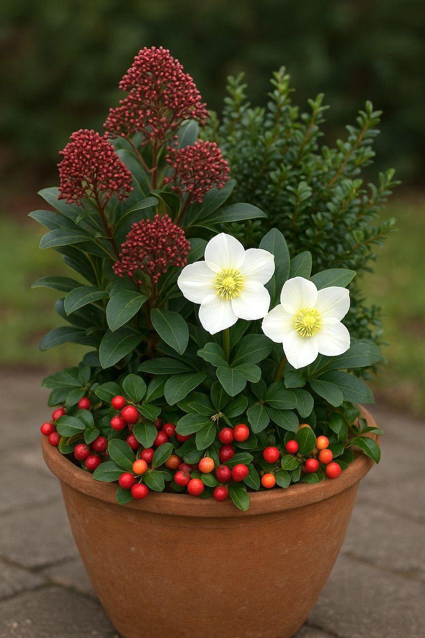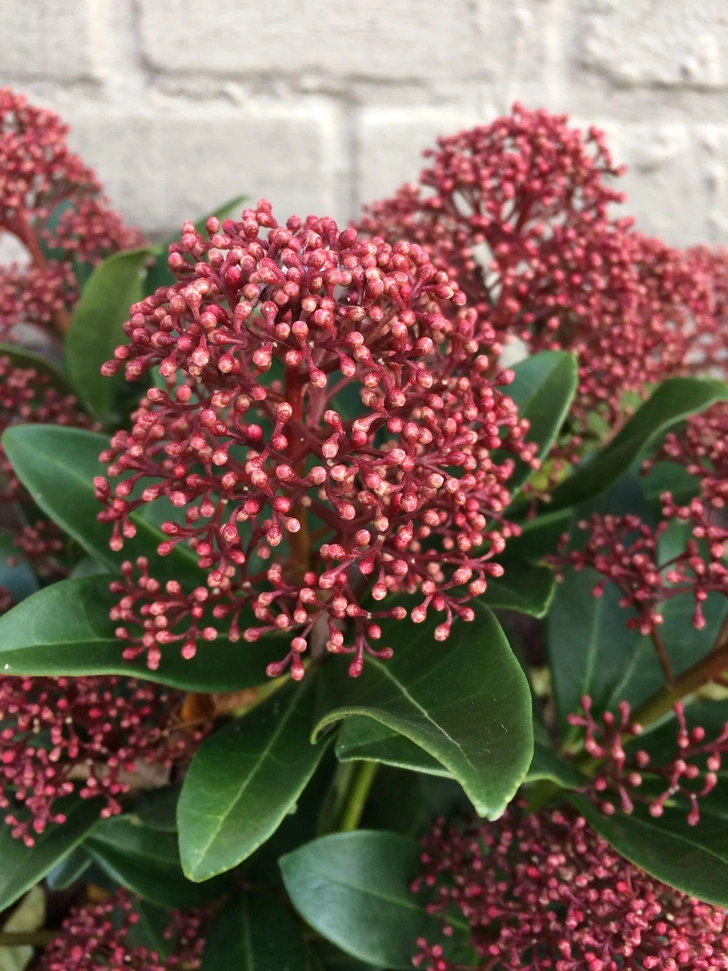 Скиммия японская «Rubella» считается отличным выбором для зимы. Этот карликовый вечнозеленый кустарник ценится не только за морозостойкость, но и за декоративные бутоны, которые появляются осенью. Различают две основные разновидности: одна формирует красные бутоны, другая — белые. Весной обе раскрываются в нежные ароматные соцветия.