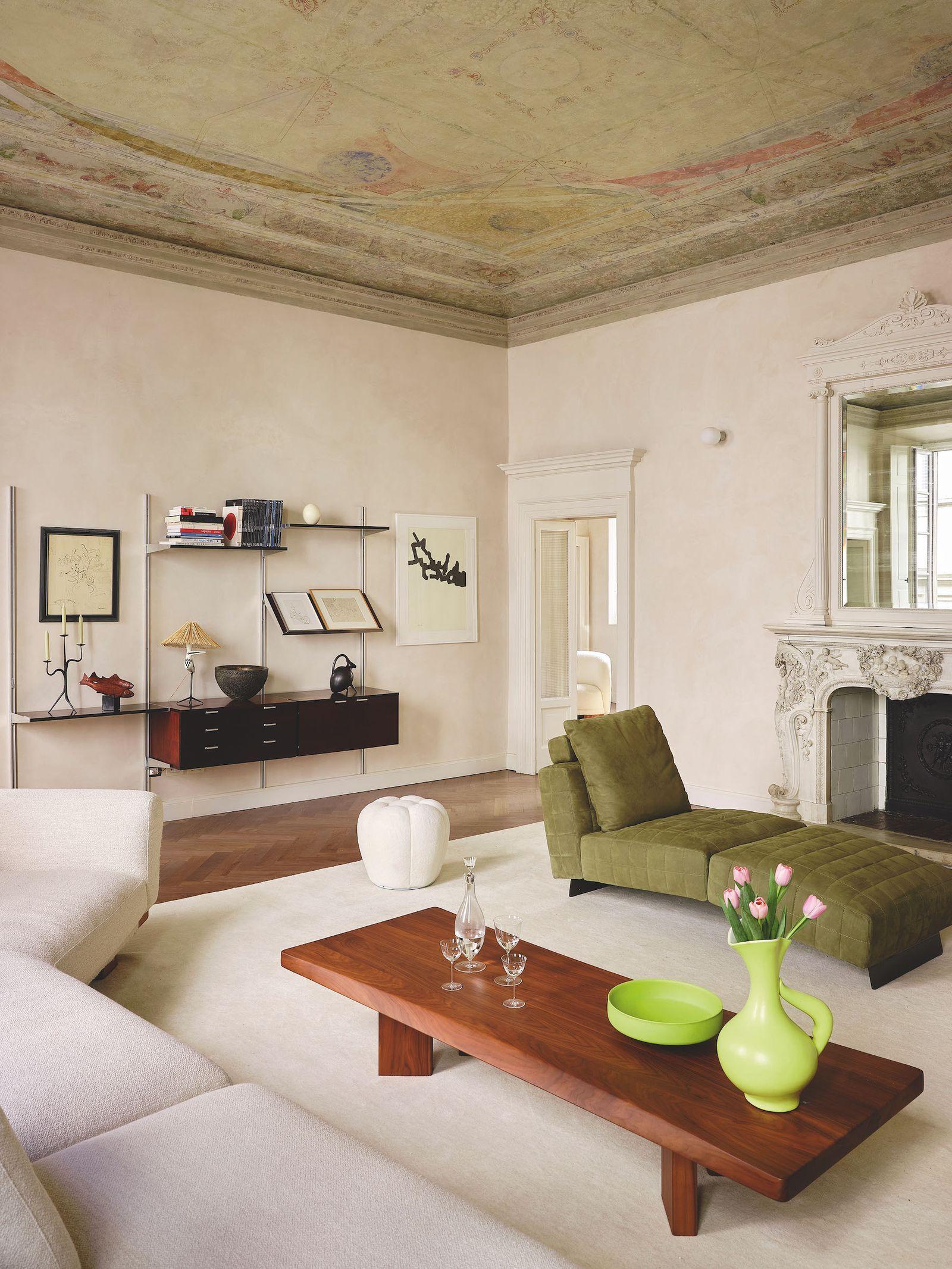 Ковер и журнальный столик, DesignBoom. Люстра, Loft Designe. Стол и стулья, Wi to You. На столе — керамическая ваза, винтаж, RetroNord. Краска, Hygge, салоны Manders.