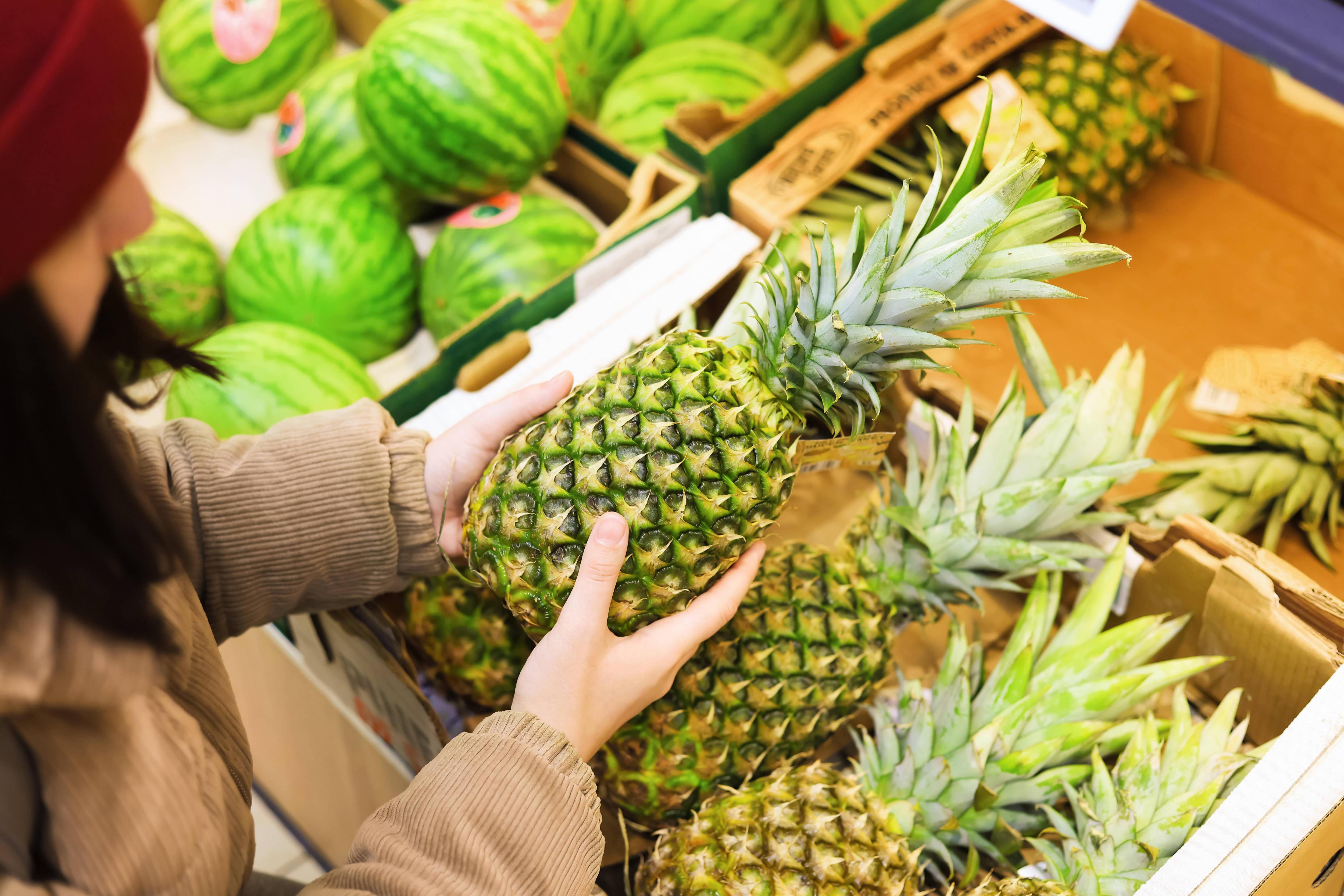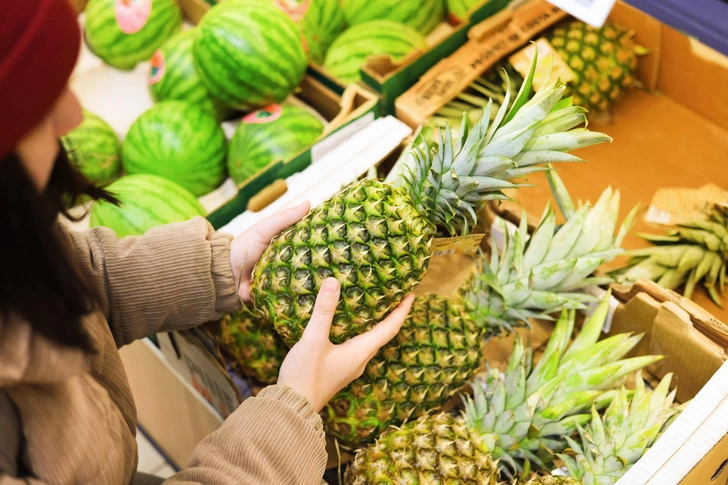 Хороший ананас ни в коем случае не должен быть твердым, как камень: при легком нажатии кожура чуть пружинит, хотя и не продавливается. Запах у спелого плода сладкий, насыщенный, но не навязчивый. Ищите аромат у основания — там он наиболее выражен. Листья в центре розетки должны быть зелеными, свежими, но легко выдергиваться. Цвет кожуры — не главный ориентир. Иногда и зеленоватый ананас оказывается вполне спелым. А вот если кожура начала темнеть, стала липкой или на ней появились мягкие пятна, лучше такой фрукт не брать.