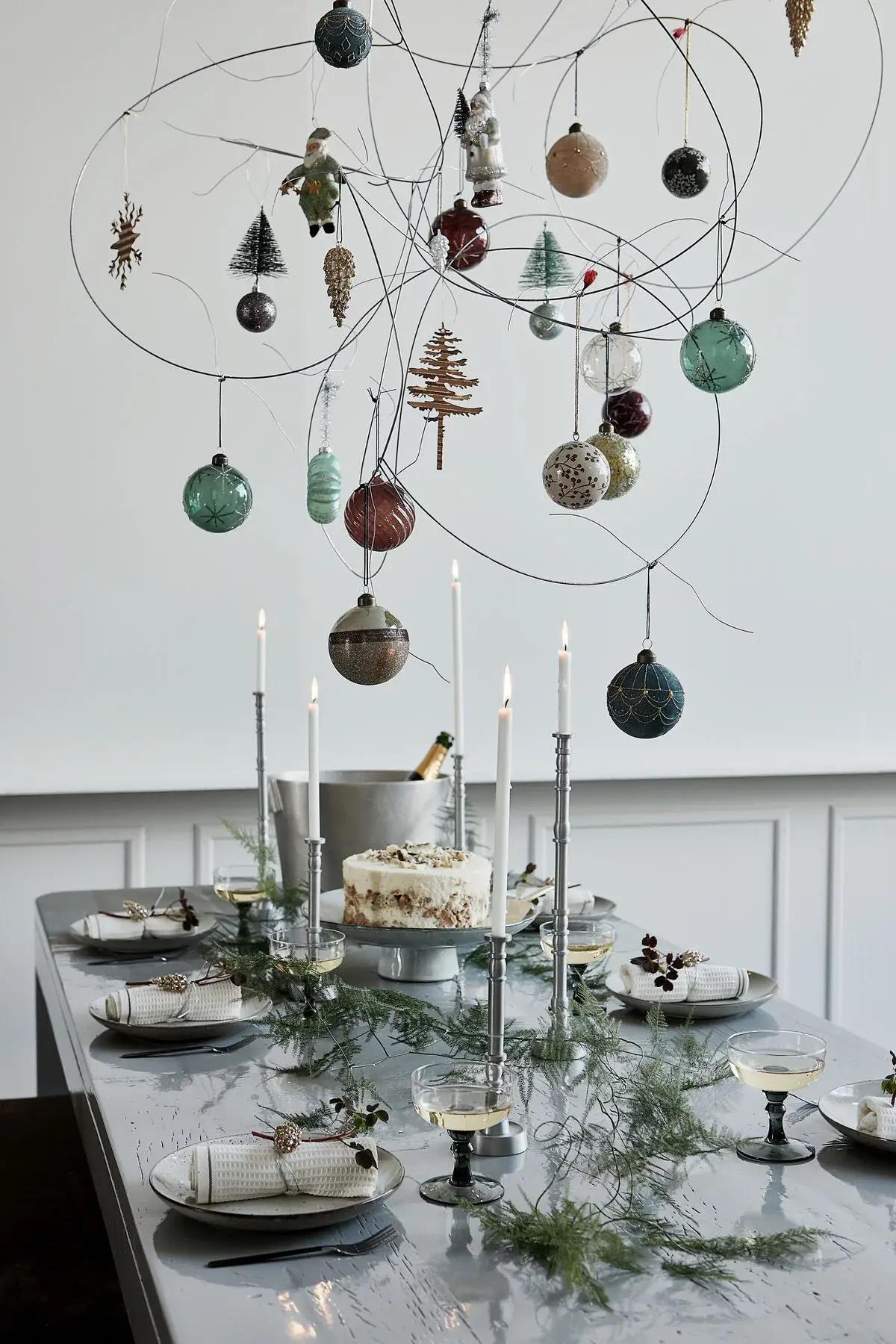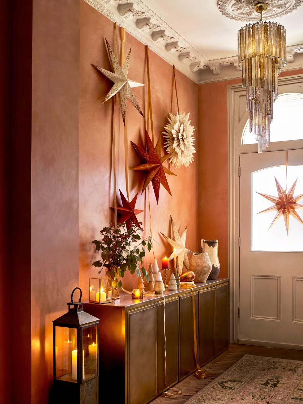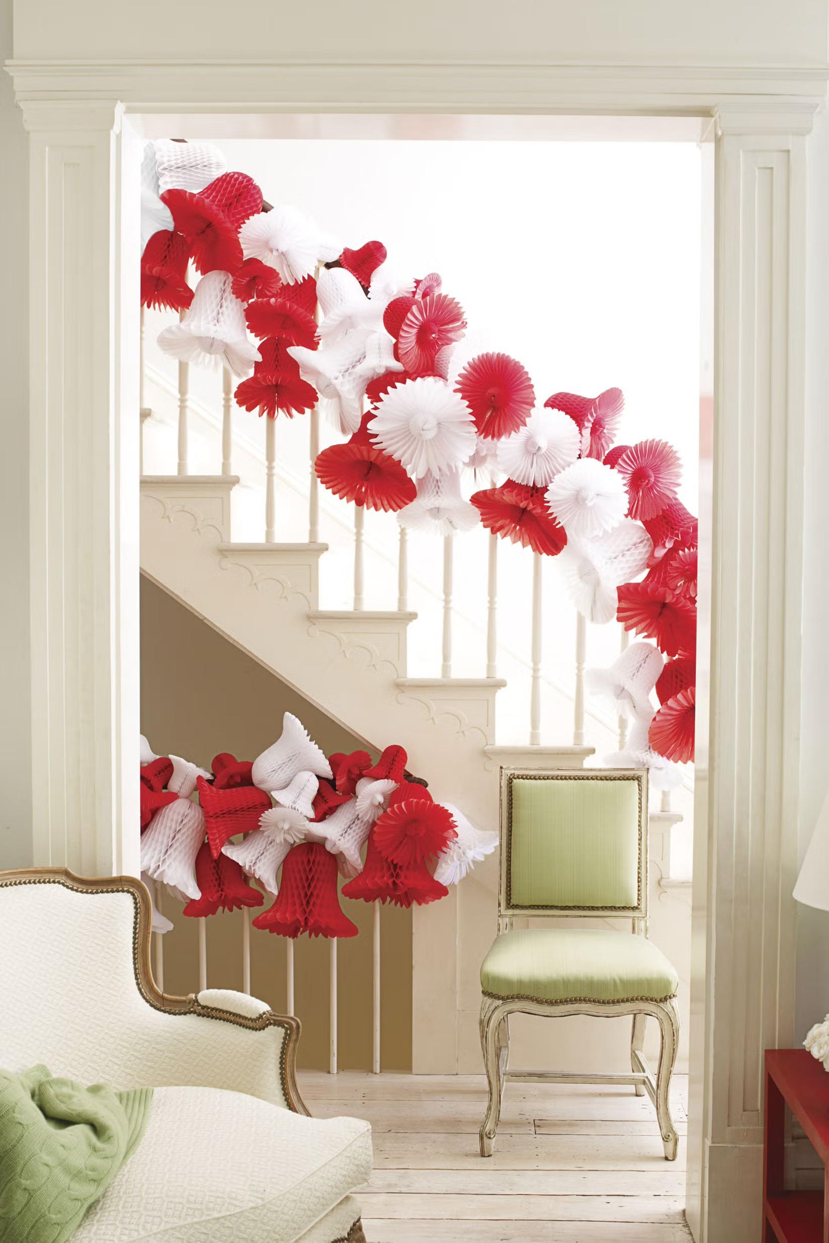 Повесьте новогодний венок из свежей или сухой зелени, большие самодельные бумажные украшения или традиционный мобиль, создающий праздничную атмосферу.